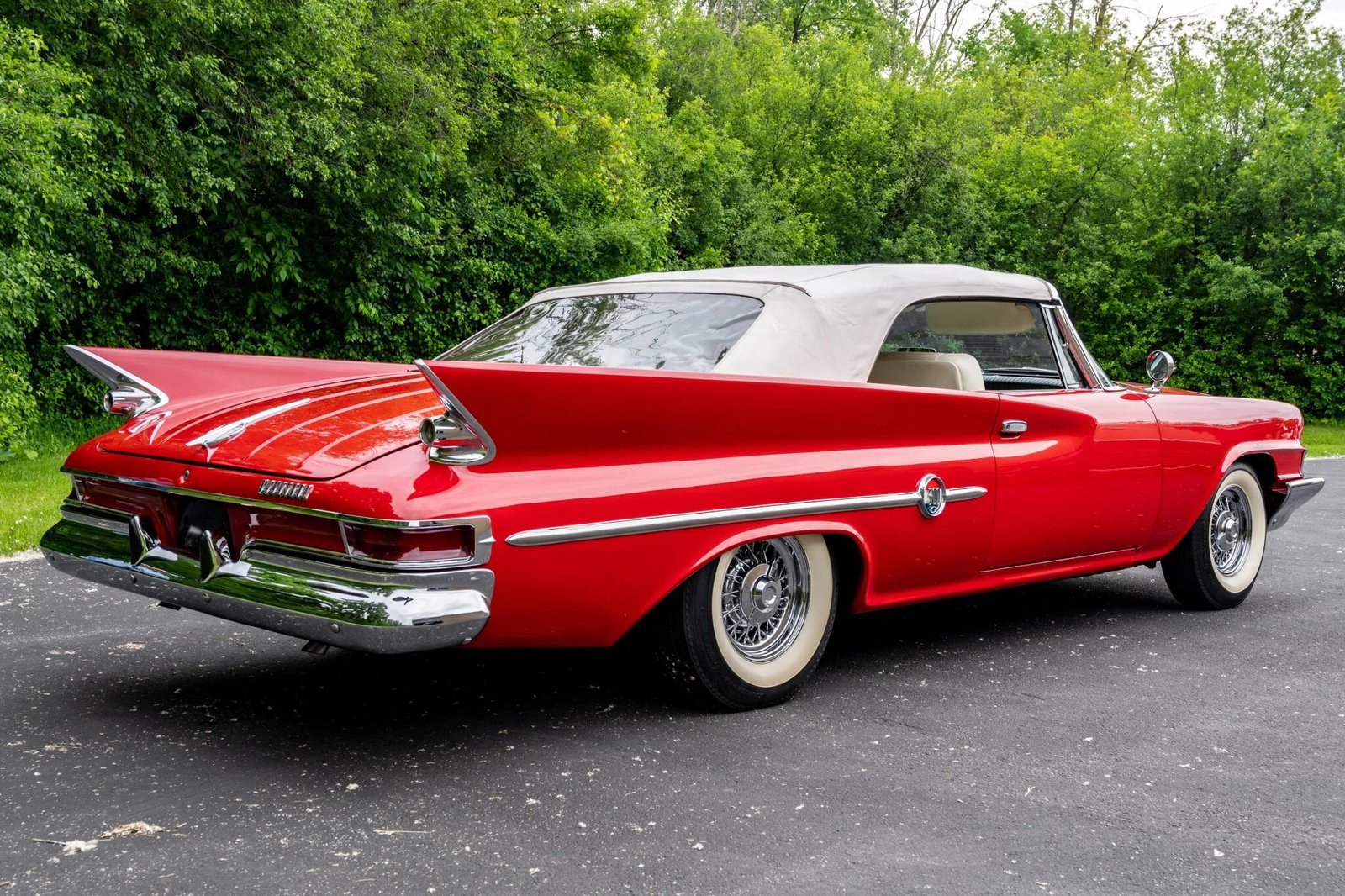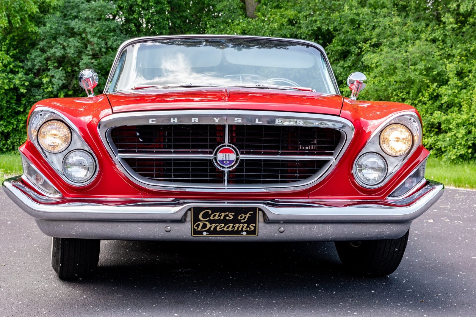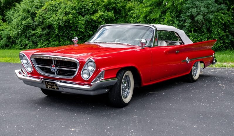 This 1961 Chrysler 300G is one of 337 convertibles produced for the model year and is finished in Mardi Gras Red over white leather upholstery. Power is provided by a 413ci V8 paired with a three-speed TorqueFlite automatic transmission. Features include a white convertible soft top, push-button transmission control, power steering, Kelsey Hayes wire wheels, wide whitewall tires, a cross-ram intake with dual Edelbrock four-barrel carburetors, MSD electronic ignition, power windows, and a Golden-Touch AM radio.