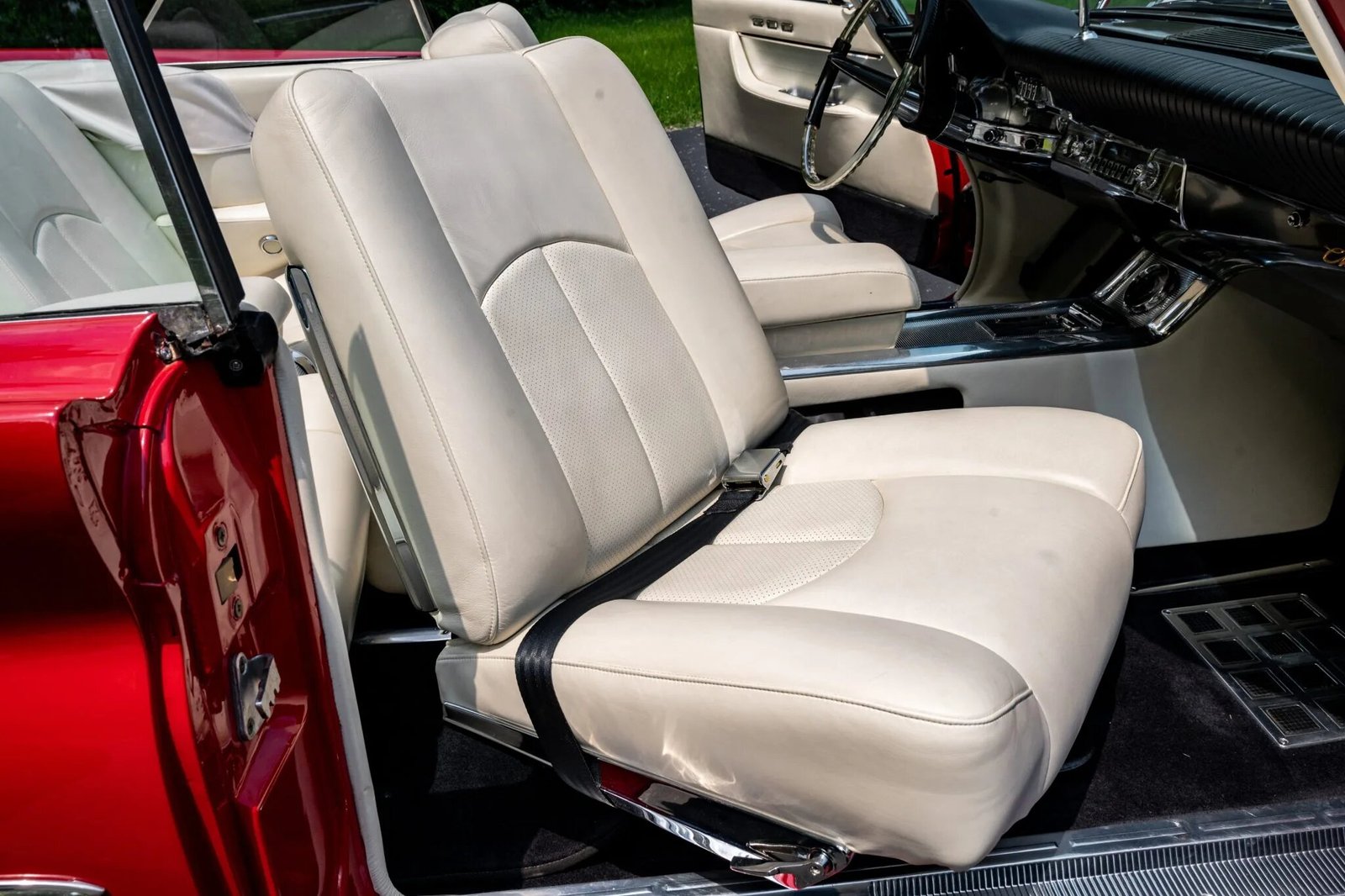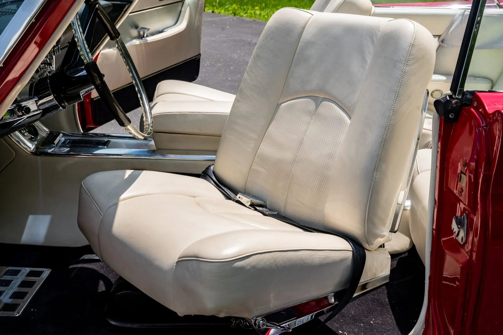 The cabin features front bucket seats and a rear bench upholstered in white leather joined by a color-coordinated center console, door panels, and convertible top boot.