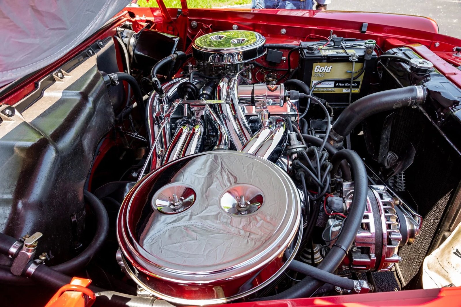 The 413ci wedge-head V8 breathes through twin Edelbrock four-barrel carburetors on a polished cross-ram intake manifold with individual runners.