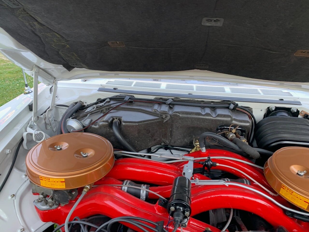 The 413ci V8 features dual four-barrel carburetors mounted on long ram-induction intake manifolds and was rated at 375 horsepower from the factory.