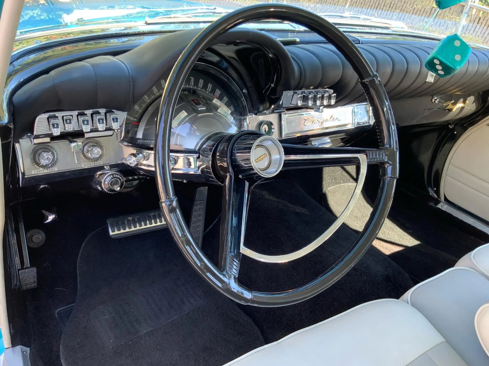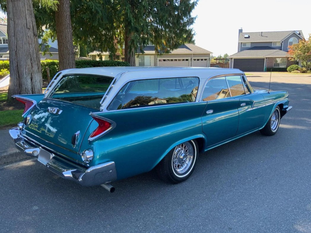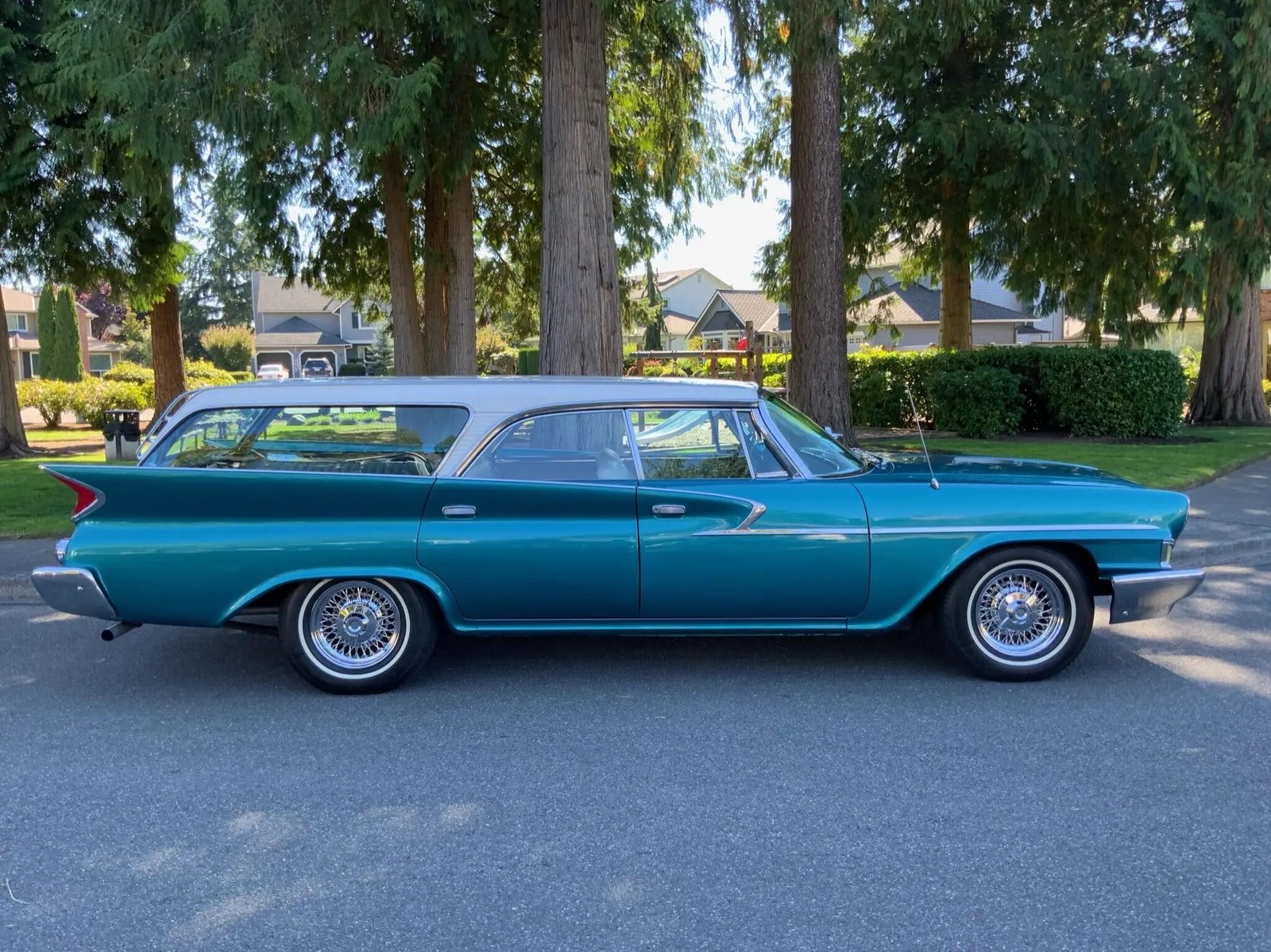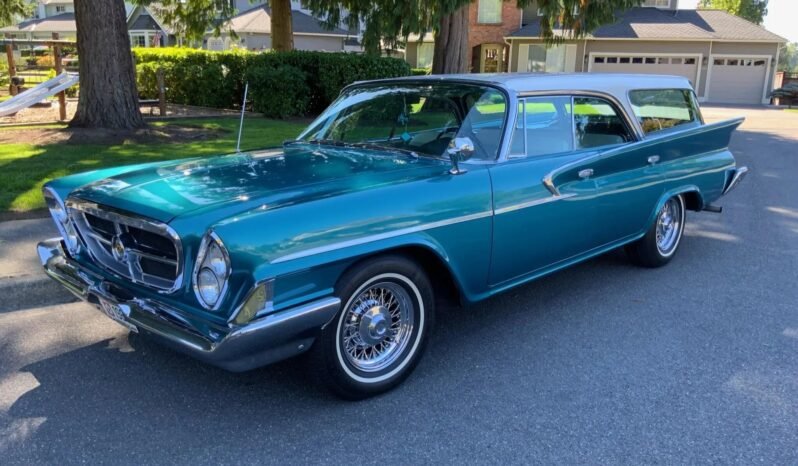 This 1961 Chrysler Newport wagon is finished in teal blue and white over parchment leather and powered by a replacement 440ci V8 paired with a Torqueflite three-speed automatic transmission. Features include angled quad headlamps, finned quarter panels, power front disc brakes, power steering, a push-button transmission gear selector, remote mirror control, 3-row seating with a stowable rear-facing bench seat, and chrome 15″ wire wheels.