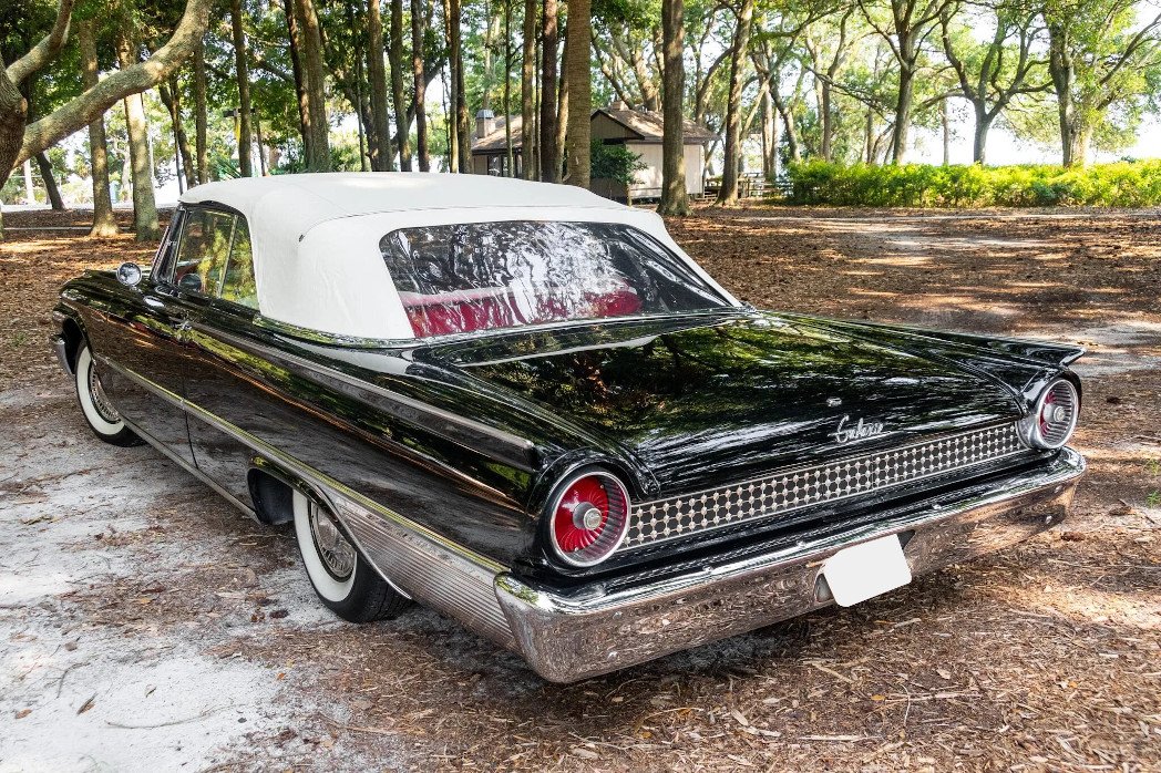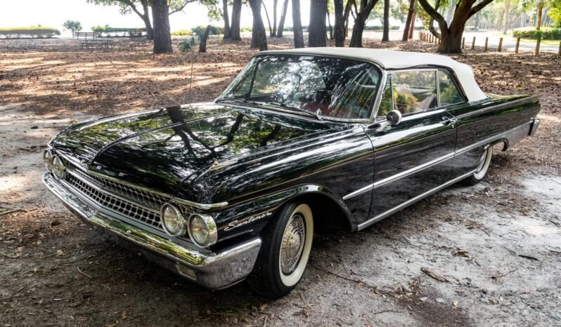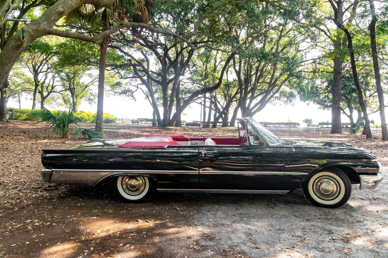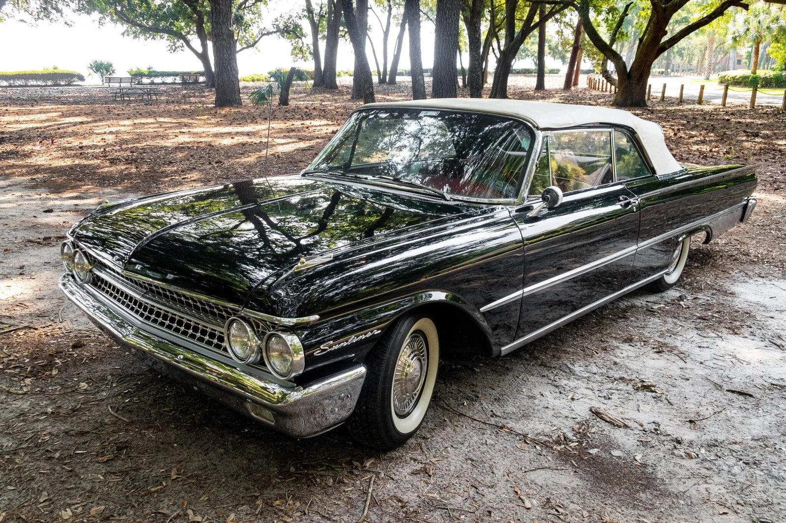Exterior features include chrome bumpers, polished bodyside trim, Sunliner badging, and a white convertible top, the latter of which is protected by a red boot cover when lowered.