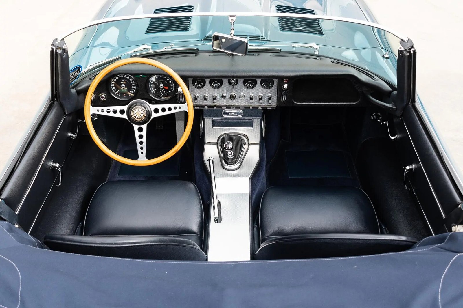 The cabin features low-back seats trimmed in dark blue leather upholstery with matching door panels, sills, sides of the console, and carpets.