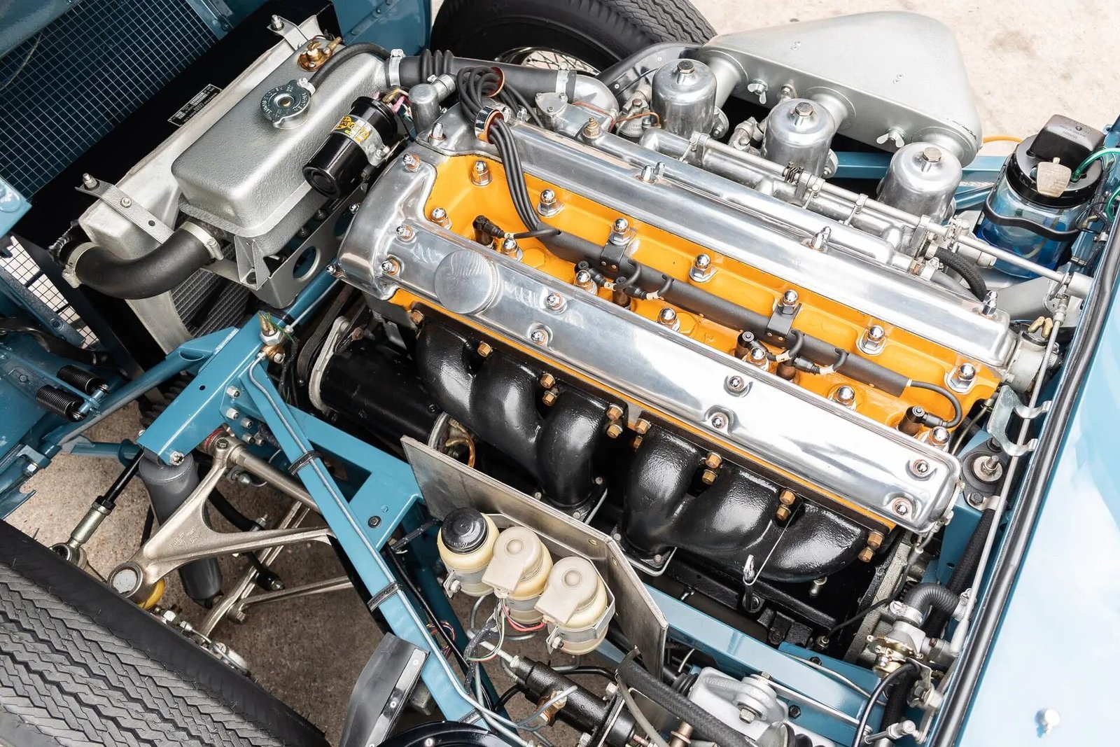 The 3.8-liter inline-six features triple SU side-draft carburetors and was factory rated at 265 horsepower.