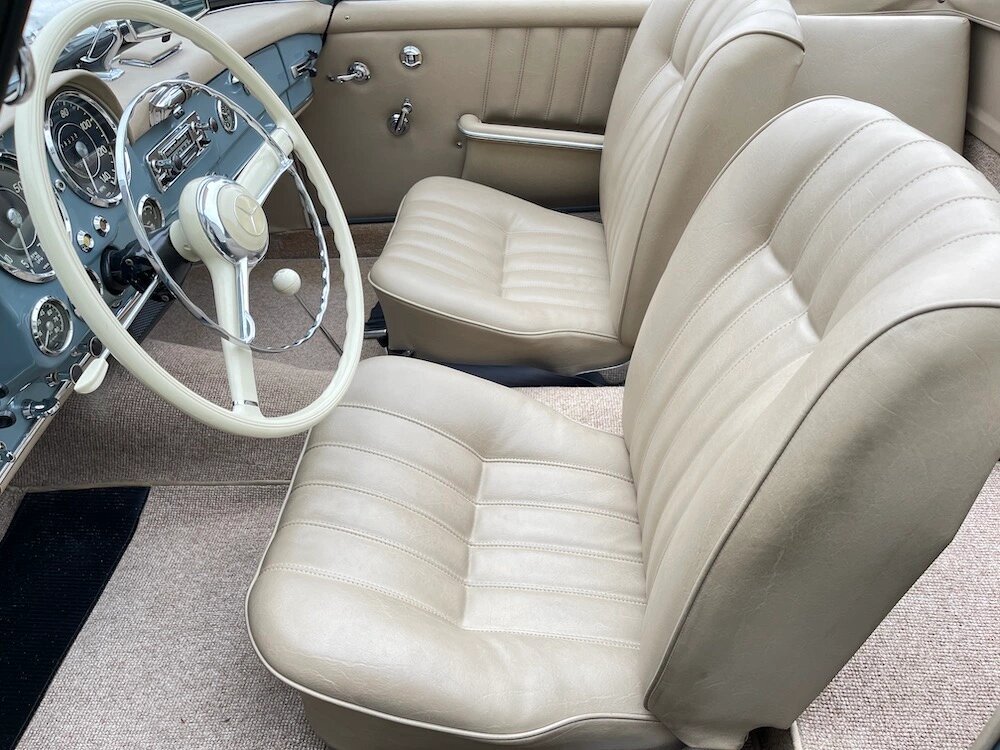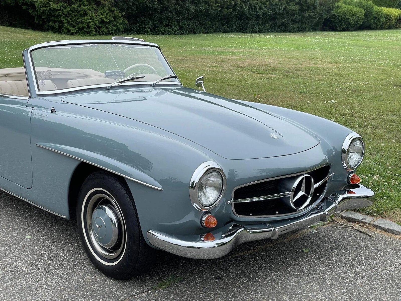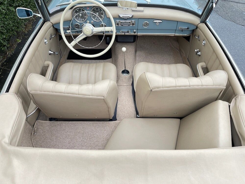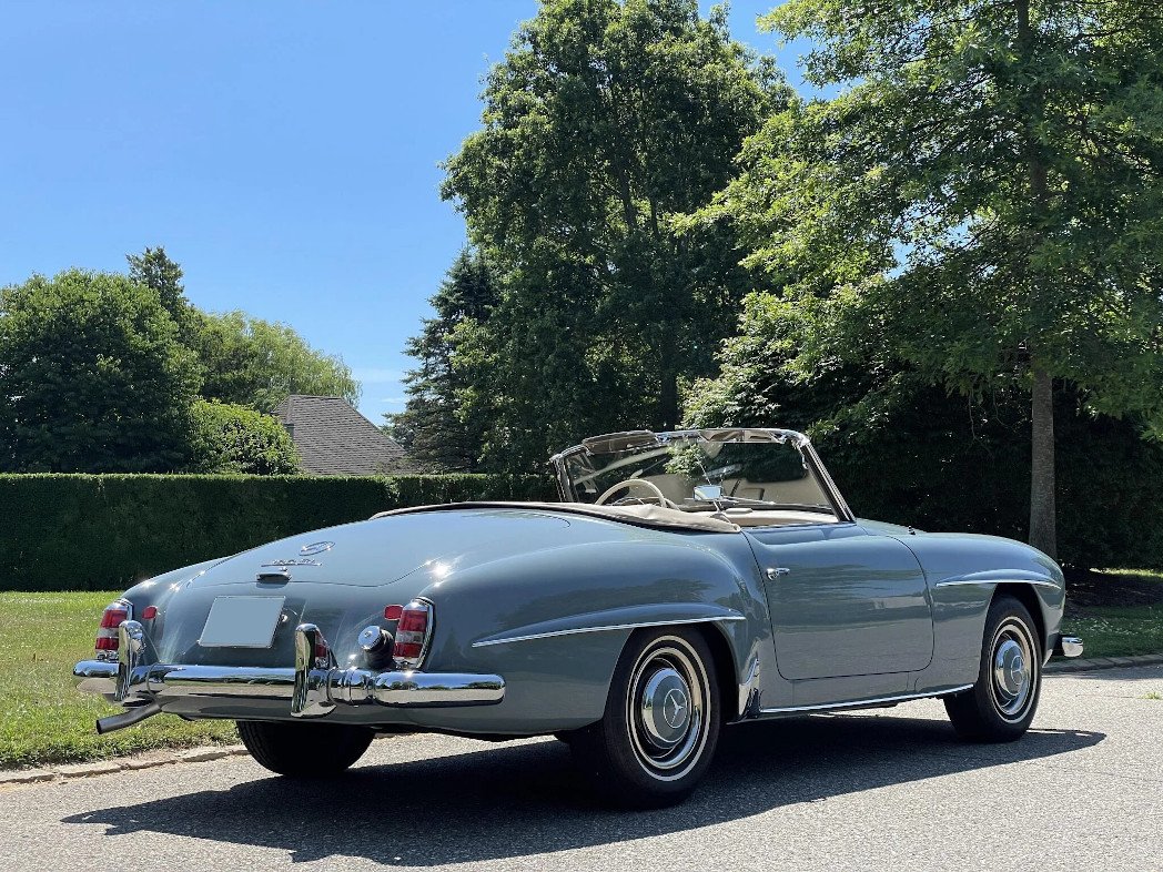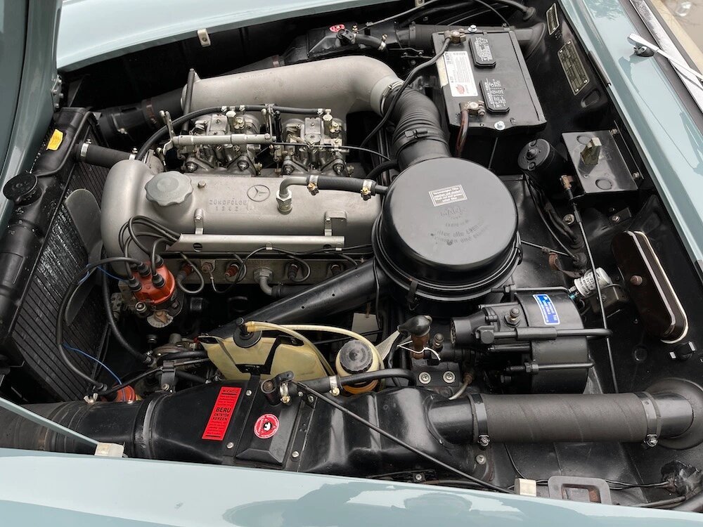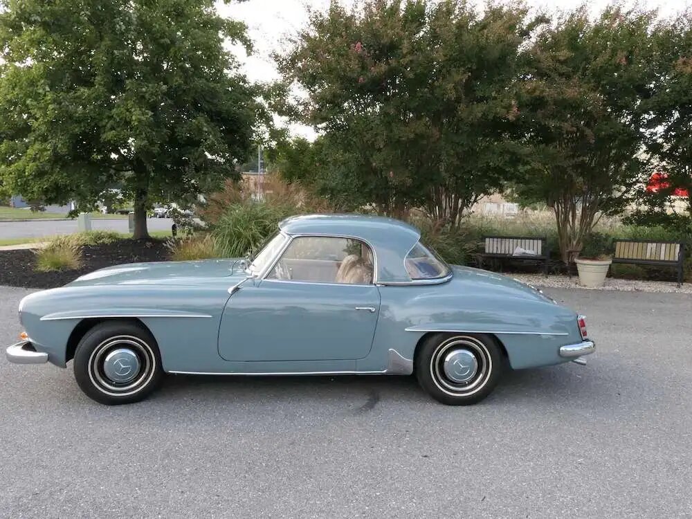 This 1961 Mercedes-Benz 190SL is powered by a 1.9-liter inline-four paired with a four-speed manual transmission and finished in blue gray over parchment leather.