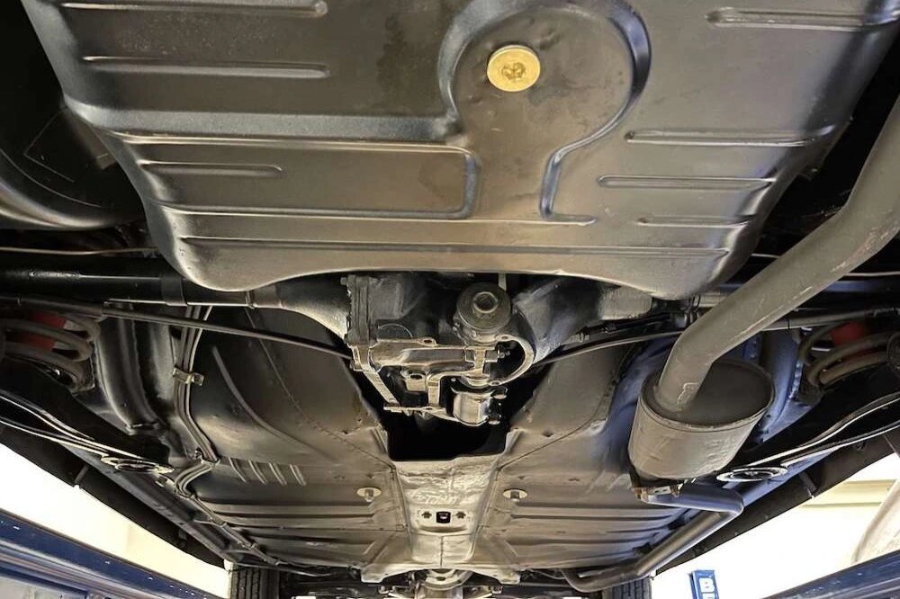 Steel 13″ wheels wear chrome trim rings, body-color hubcaps, and Goodyear white stripe tires.