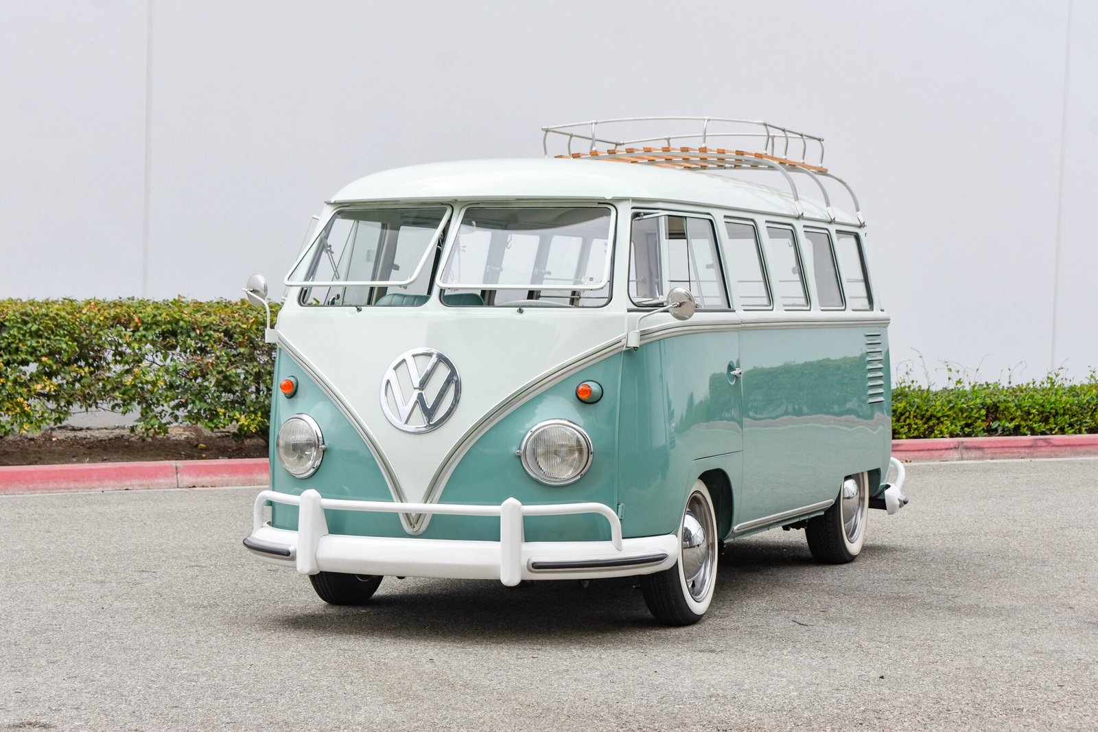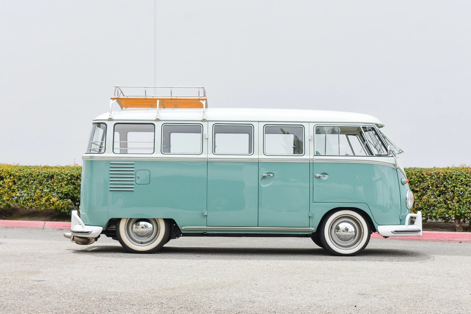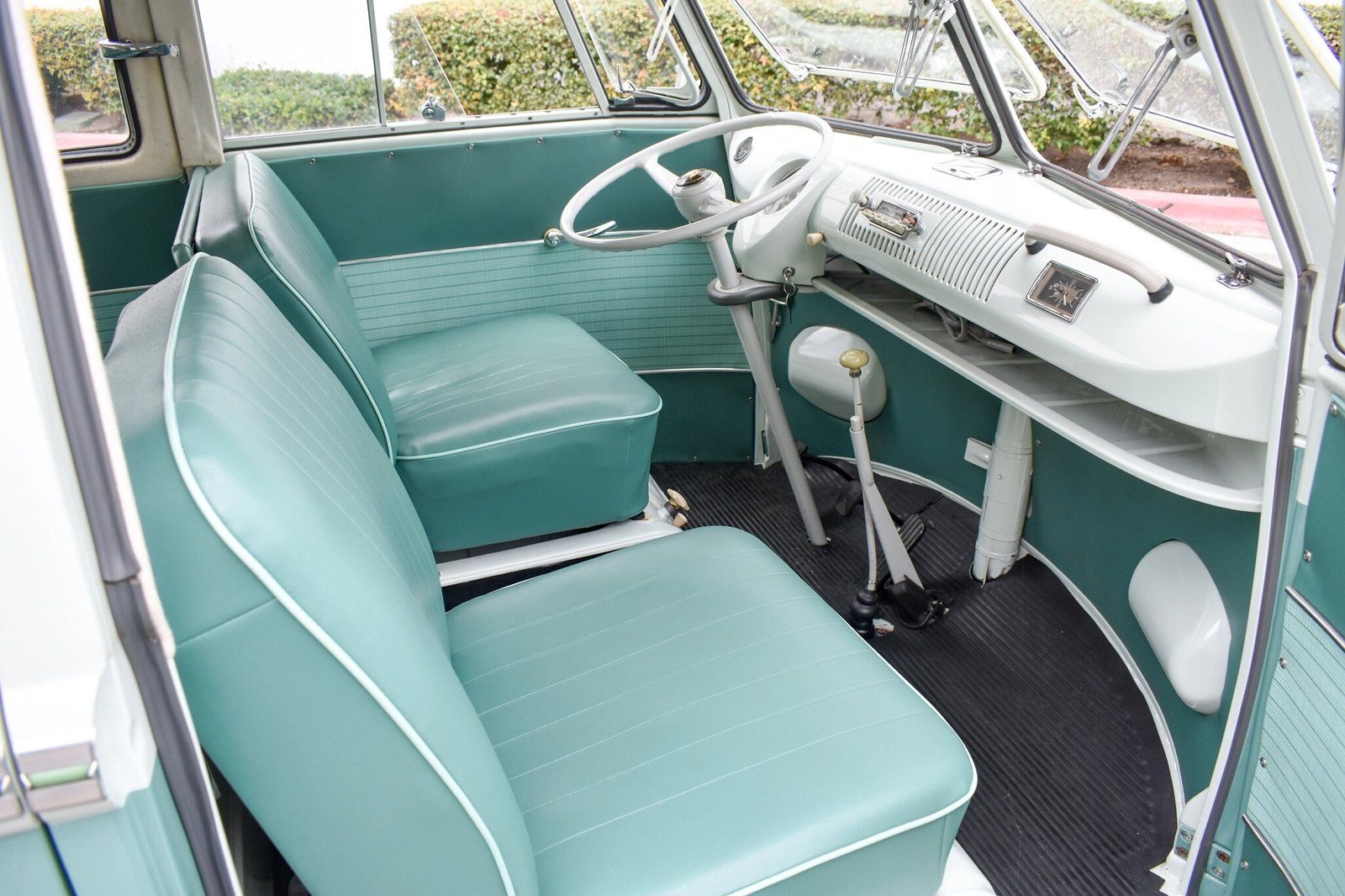 This 1961 Volkswagen Type 2 Bus is a 15-window model finished in green with a white roof over matching upholstery, and power is provided by a 1,915cc flat-four paired with a four-speed manual transaxle.
