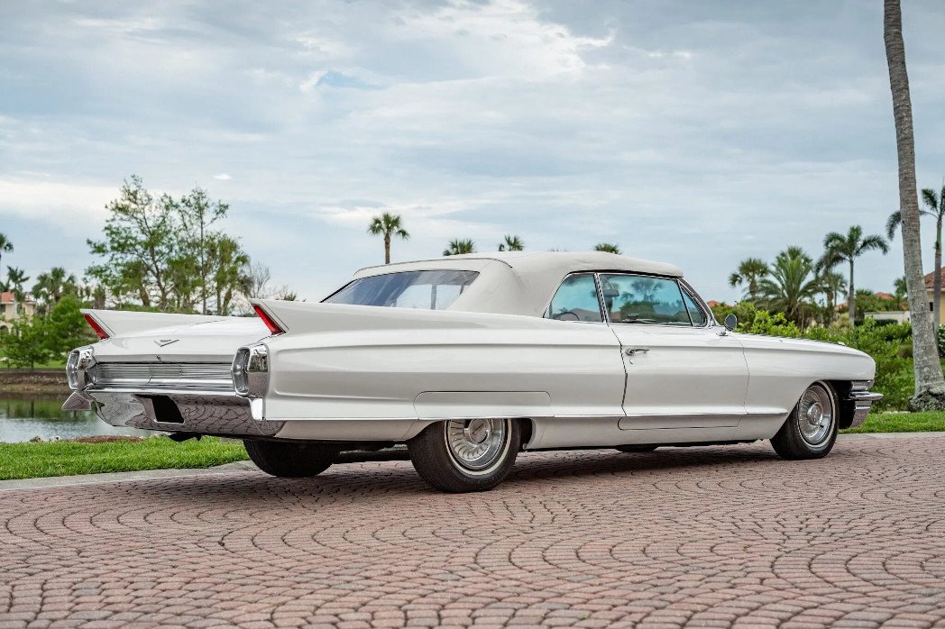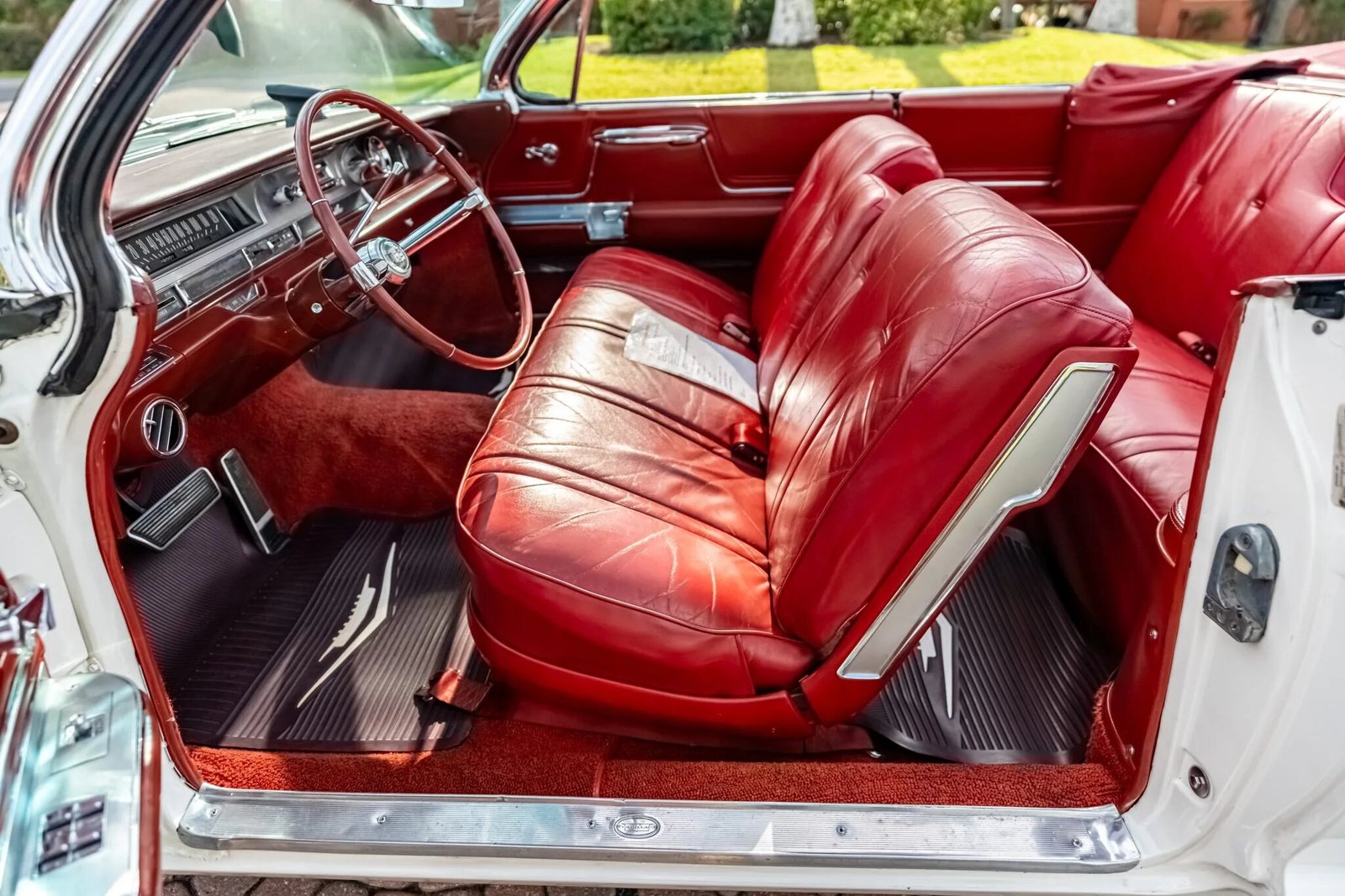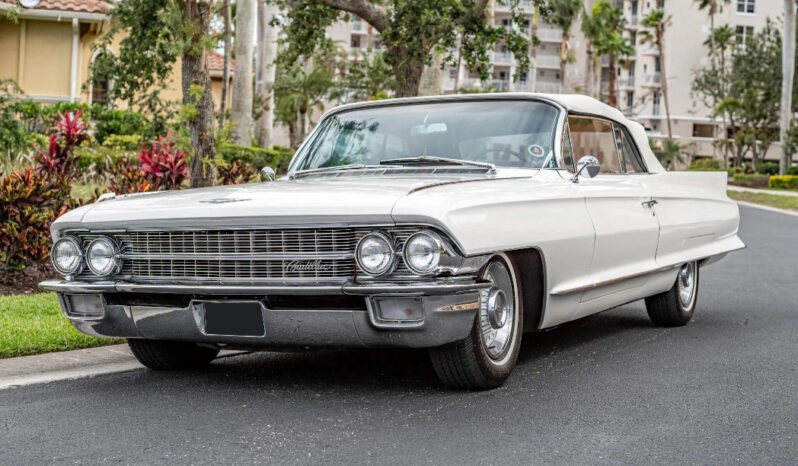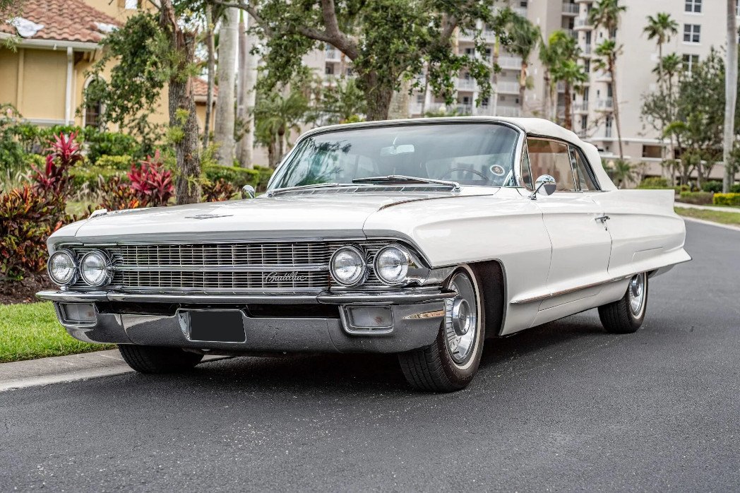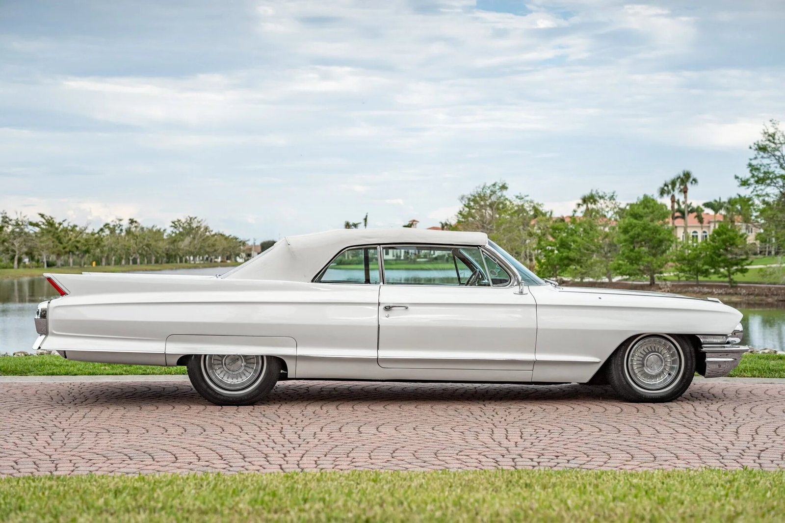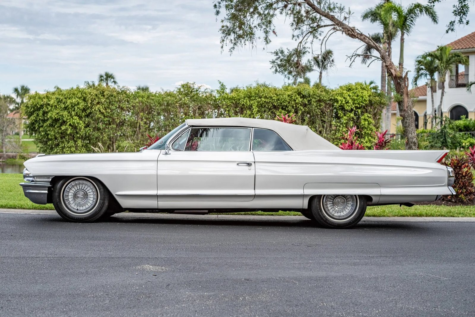 This 1962 Cadillac Series 62 convertible is finished in white with a white soft top over red leather upholstery, the car is powered by a 390ci V8 paired with a Hydra-Matic four-speed automatic transmission.