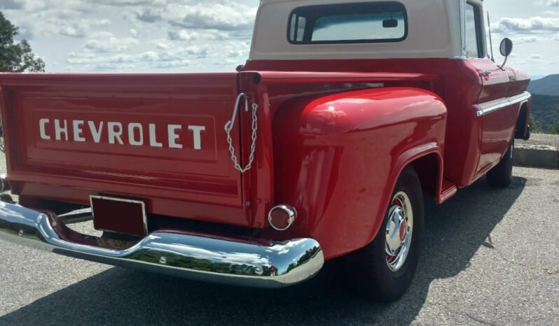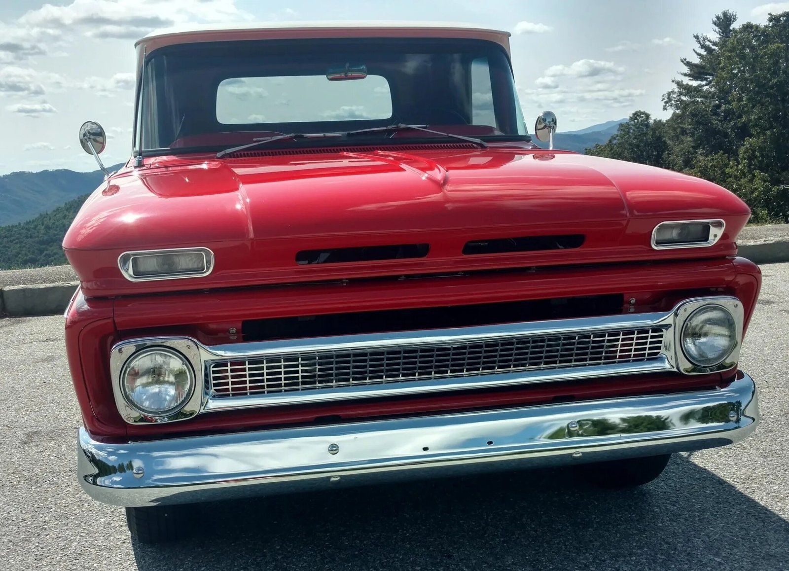 This 1962 Chevrolet C10 is a stepside pickup finished in red and white over black vinyl and is powered by a 235ci inline-six paired with a three-speed manual transmission.