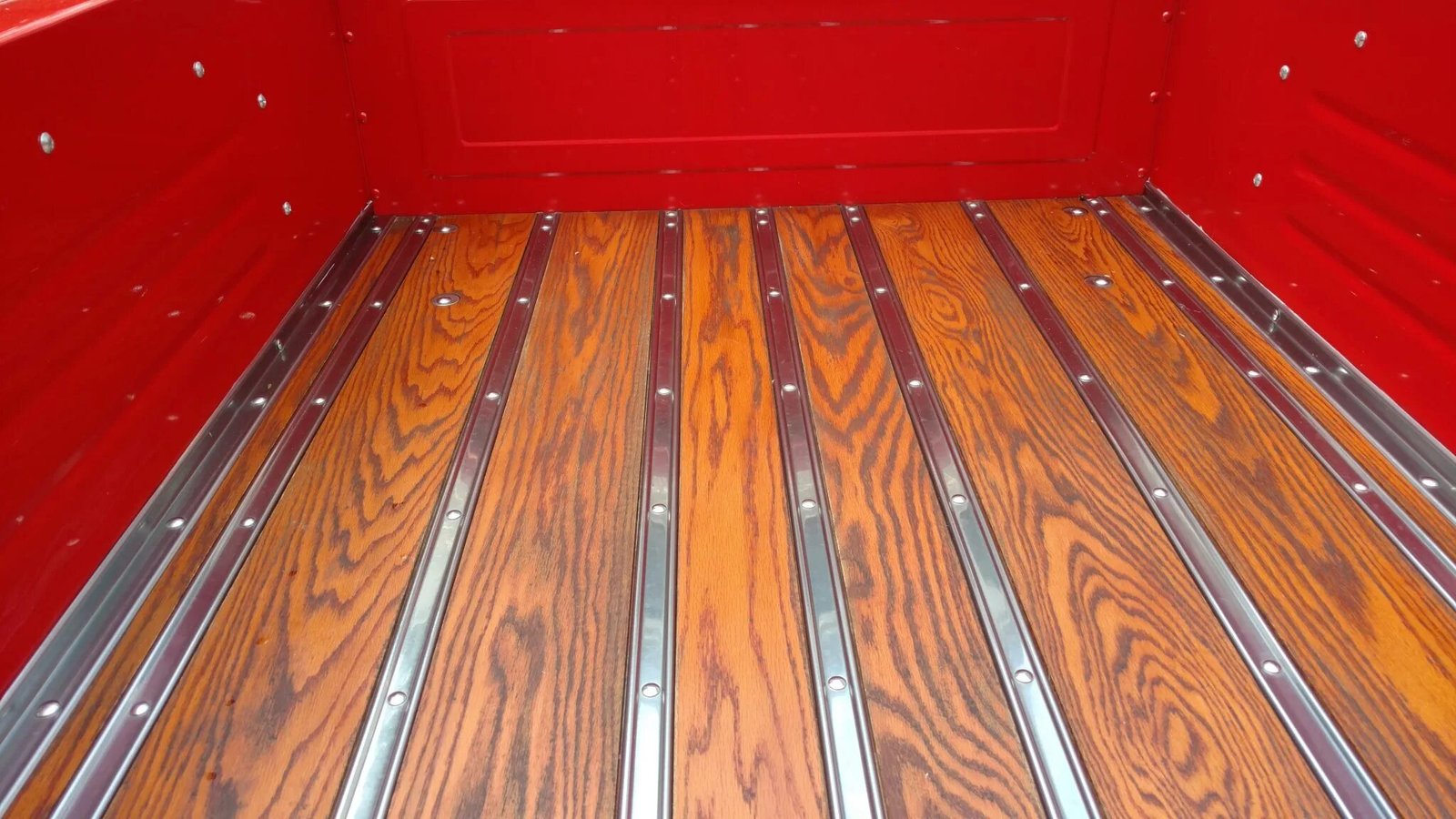 The truck has been refinished in red and white and features chrome bumpers and a wood slat bed.