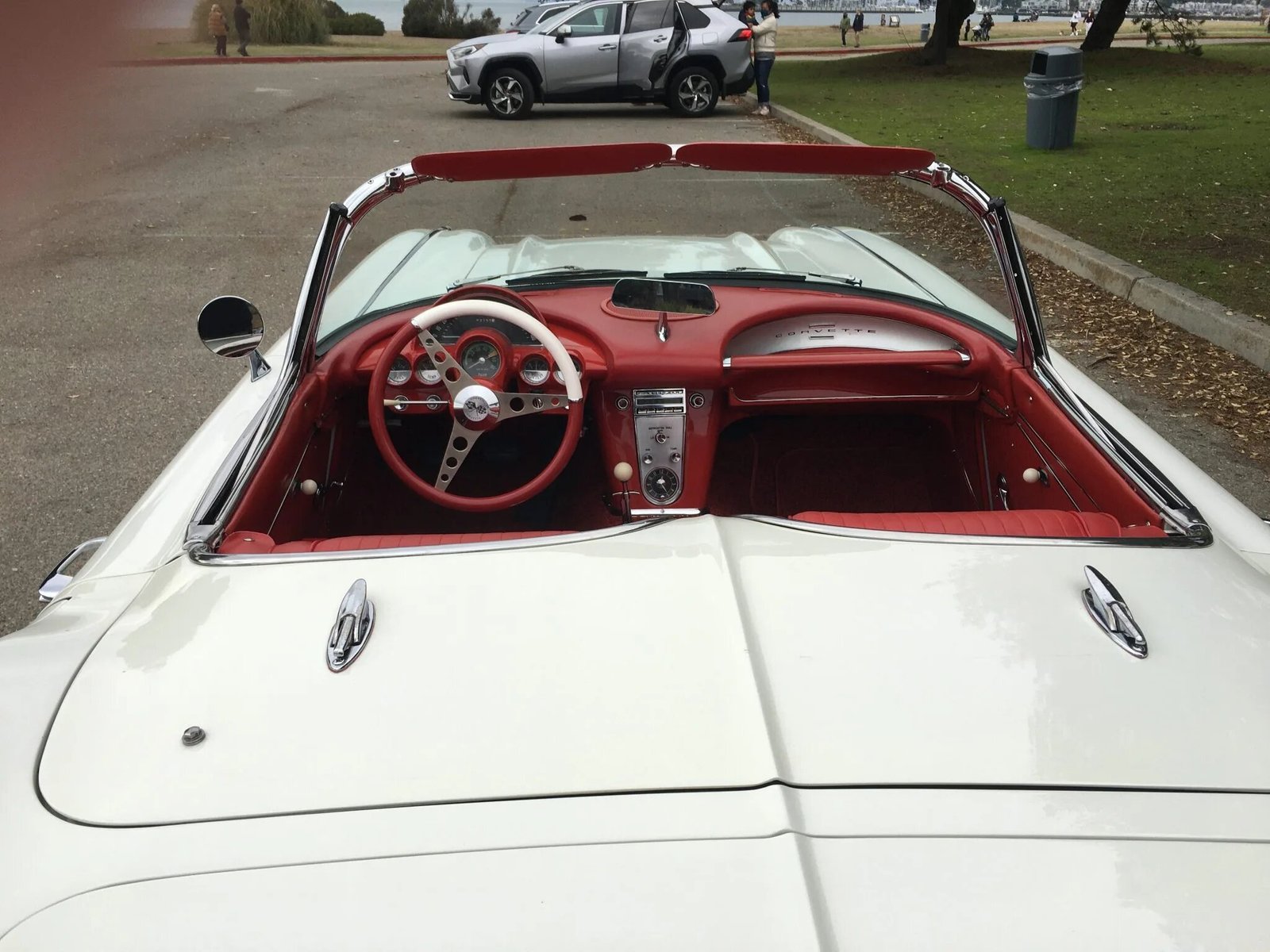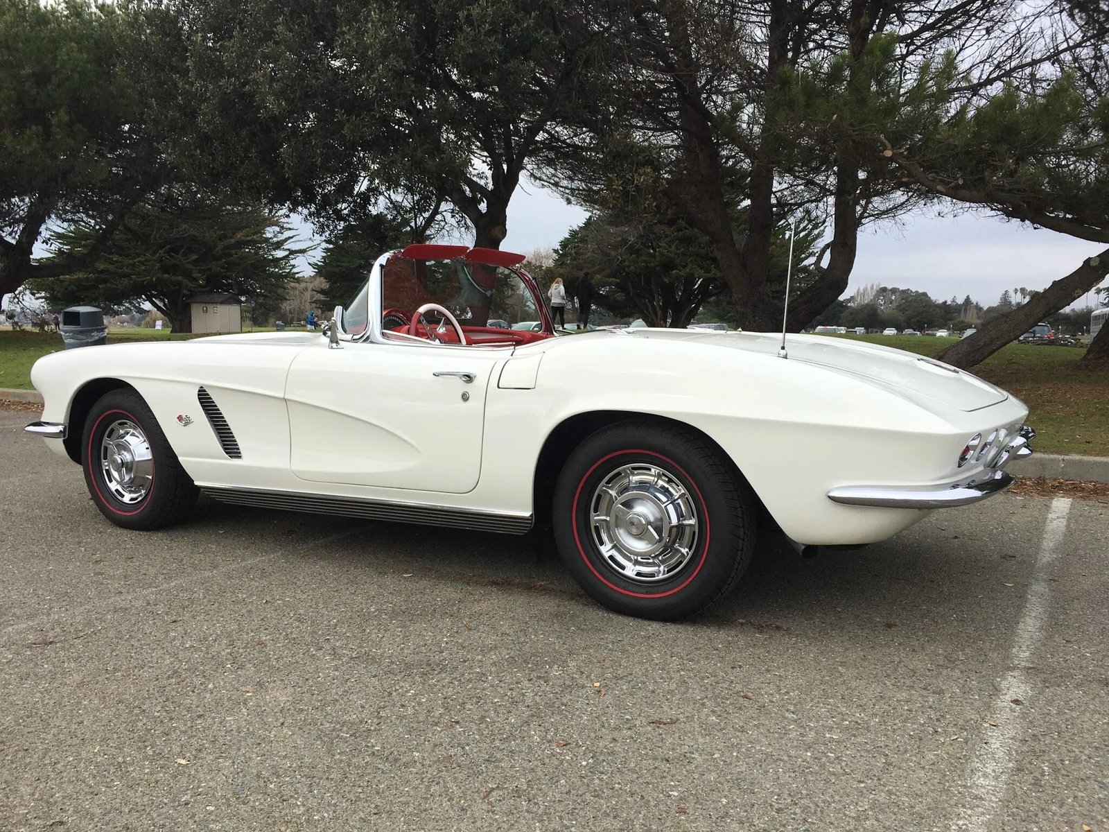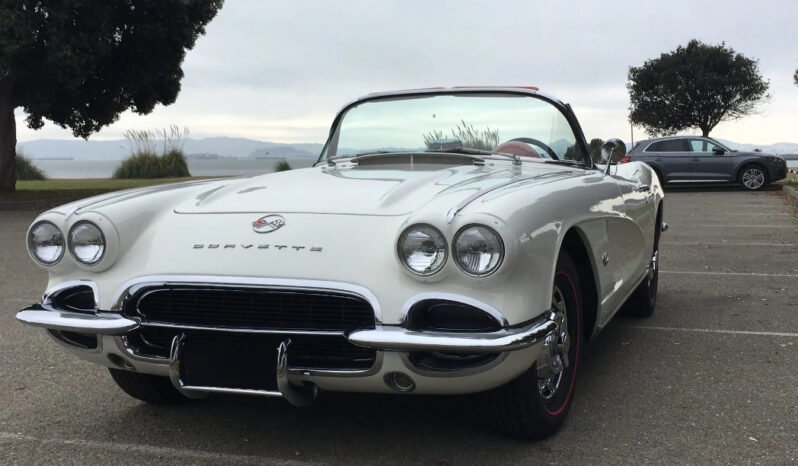 This 1962 Chevrolet Corvette is finished in white with a matching soft top over a red vinyl interior and is powered by a 327ci V8 paired with a Muncie M20 four-speed manual transmission.