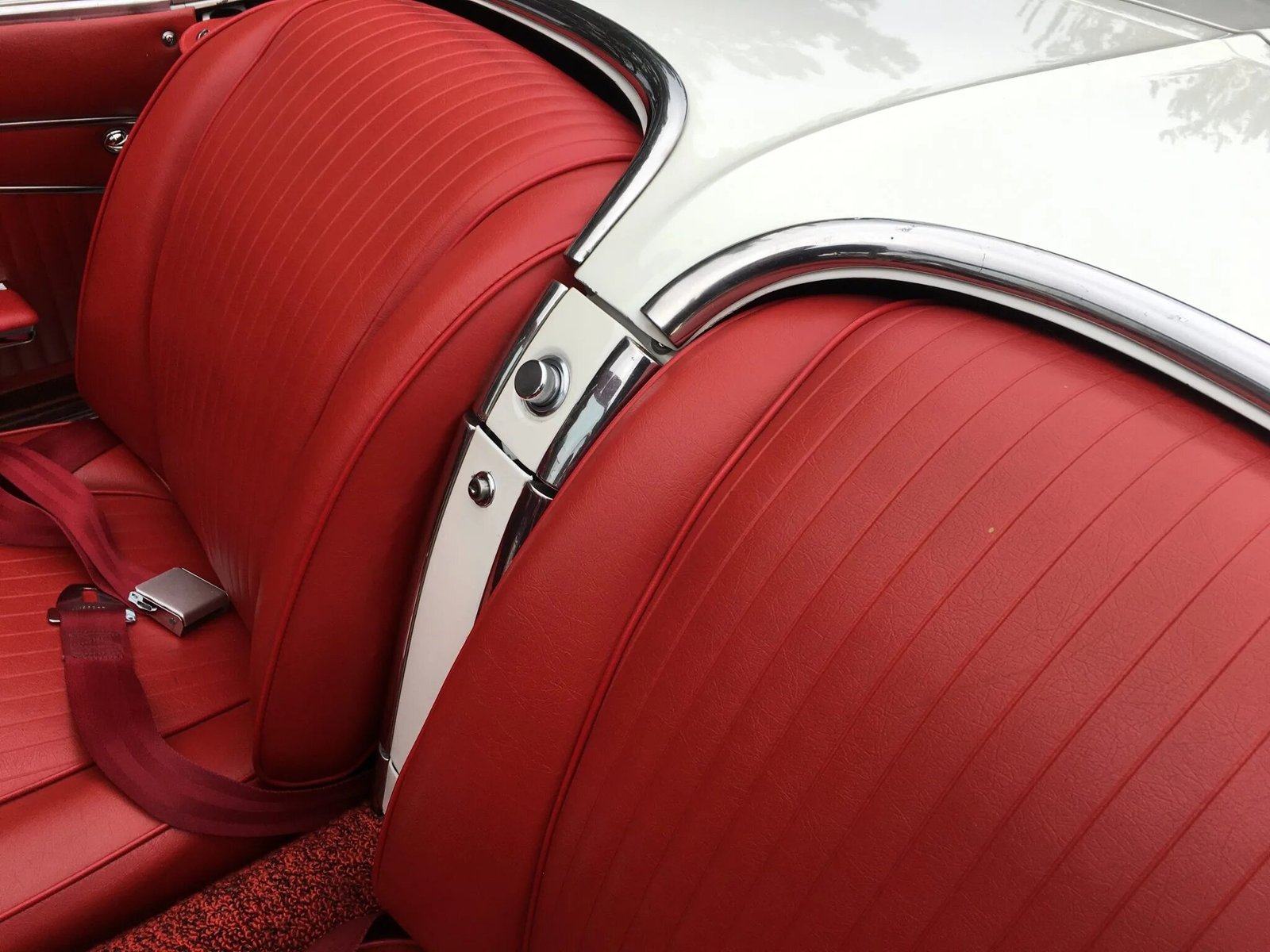 The twin bucket seats were refreshed with replacement foam pads, springs, and red vinyl upholstery, and the cabin features a matching dashboard, door panels, and carpets.