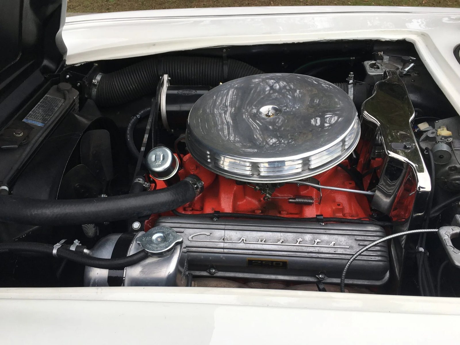The 327ci V8 features a single Carter four-barrel carburetor and was factory-rated for 250 horsepower at 4,400 rpm.