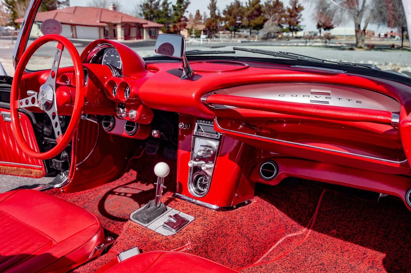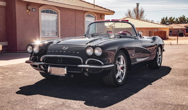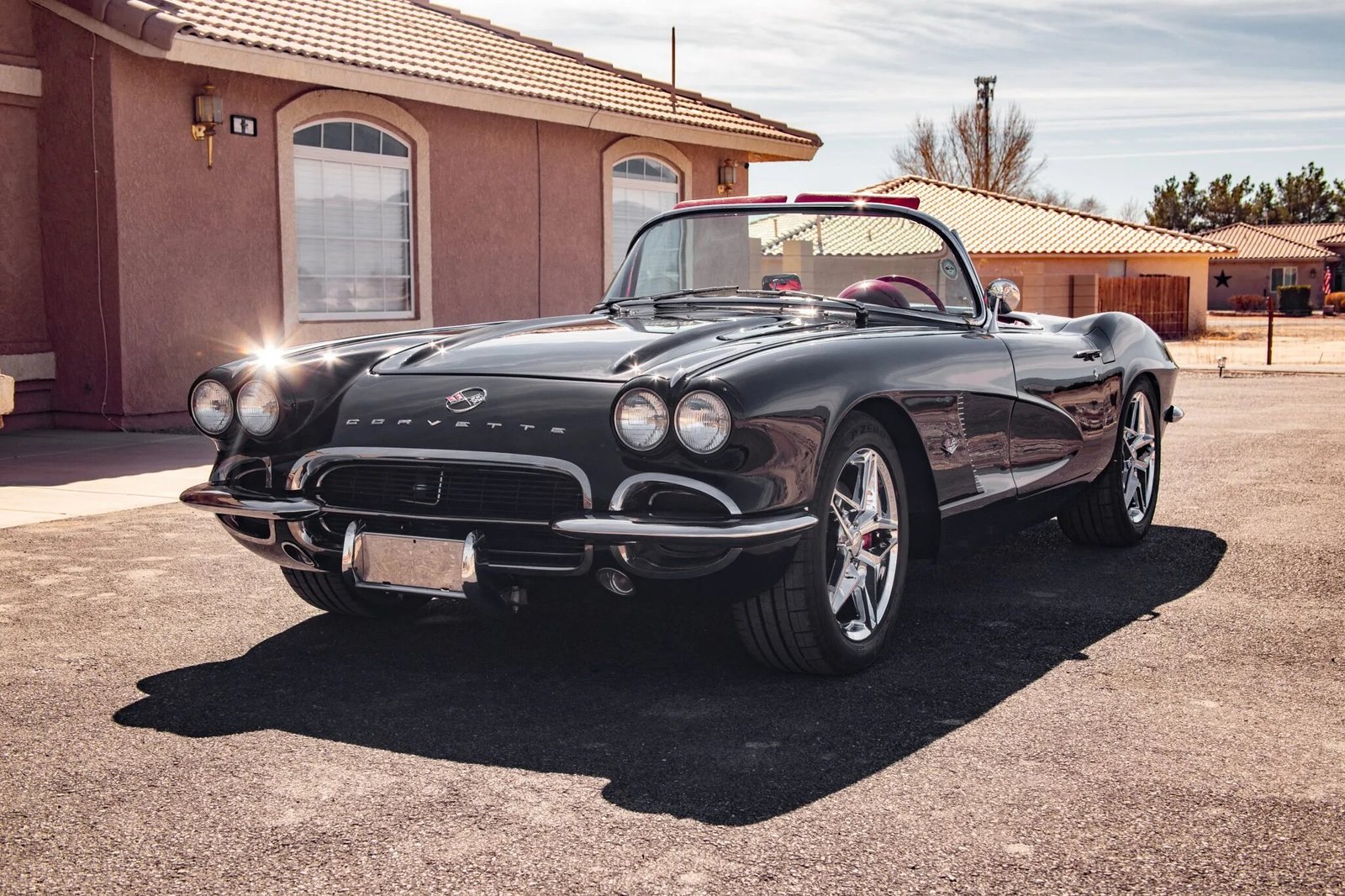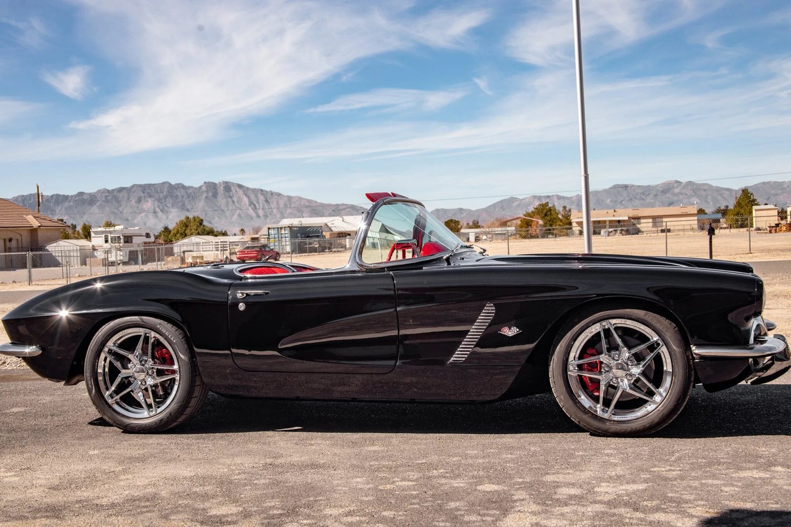 This 1962 Chevrolet Corvette is finished in black over red leather upholstery and is powered by a 6.2-liter LS3 V8 paired with a Tremec TKO five-speed manual transmission and a Dana 36 rear differential with 3.08:1 gearing.