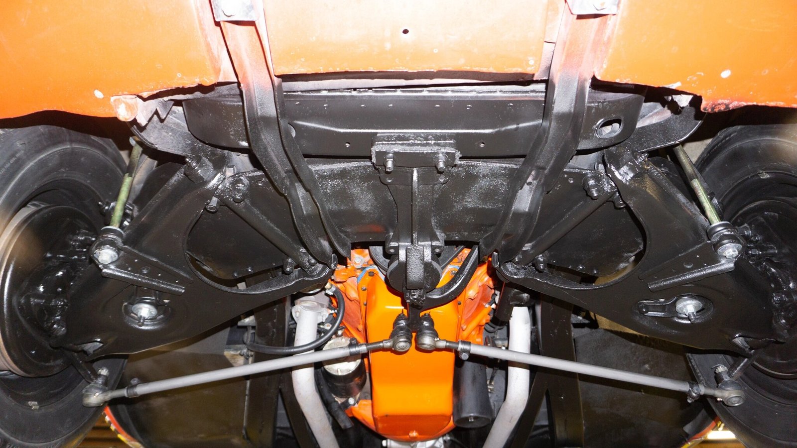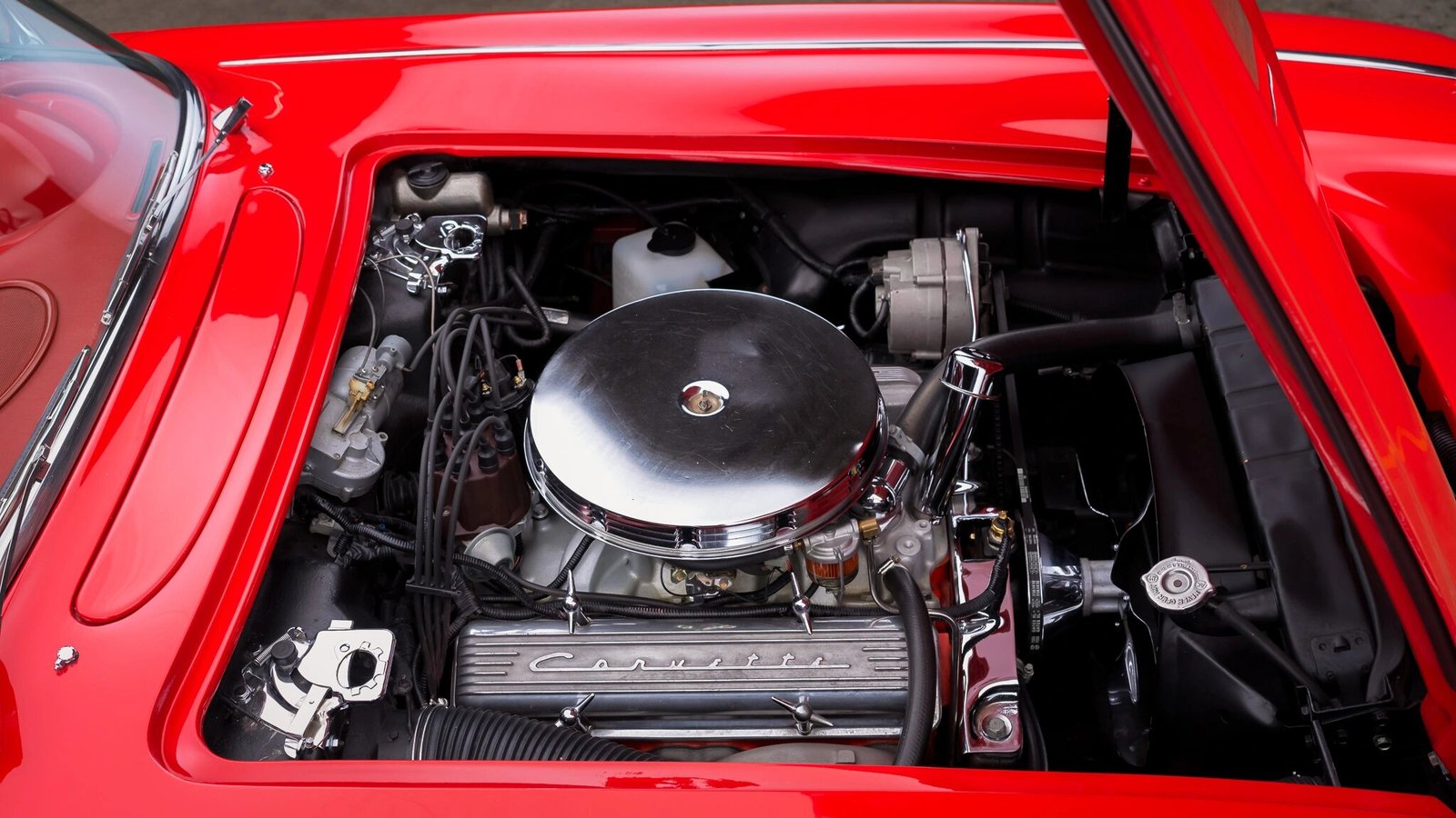 The 327ci V8 was rebuilt and is equipped with finned valve covers and chrome treatments for the air cleaner housing, ignition cover, and hood latches.