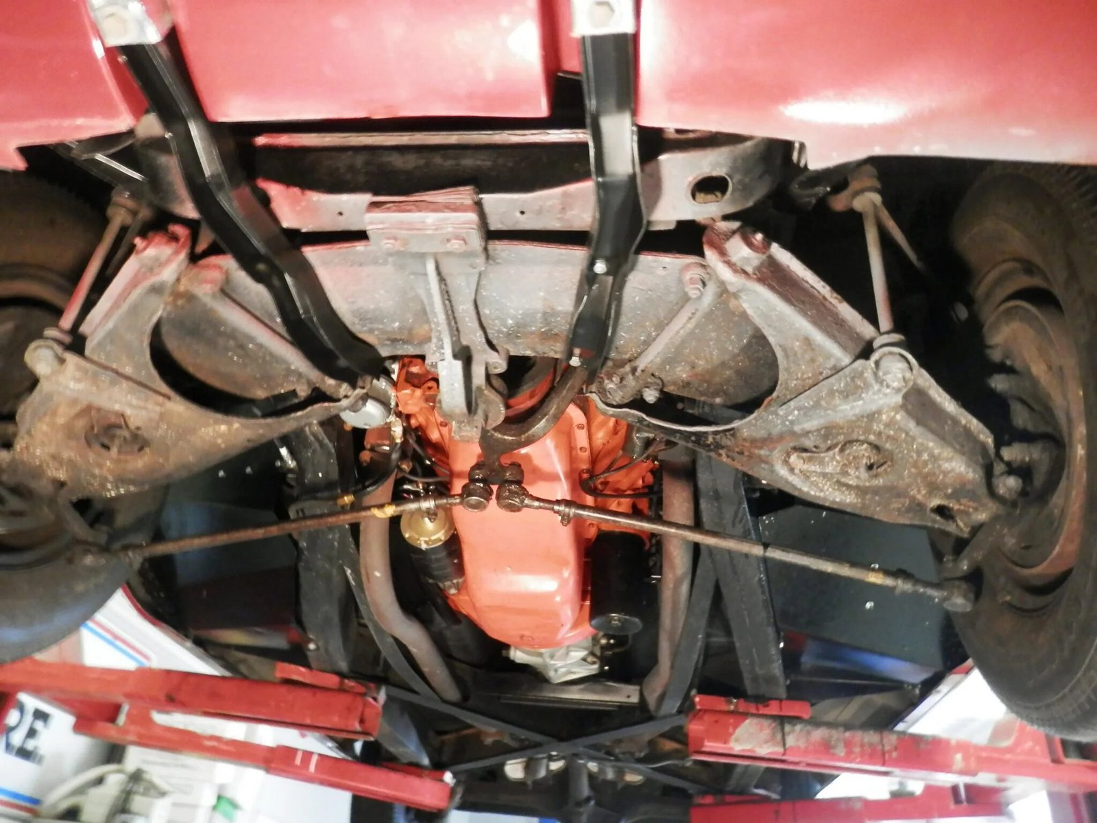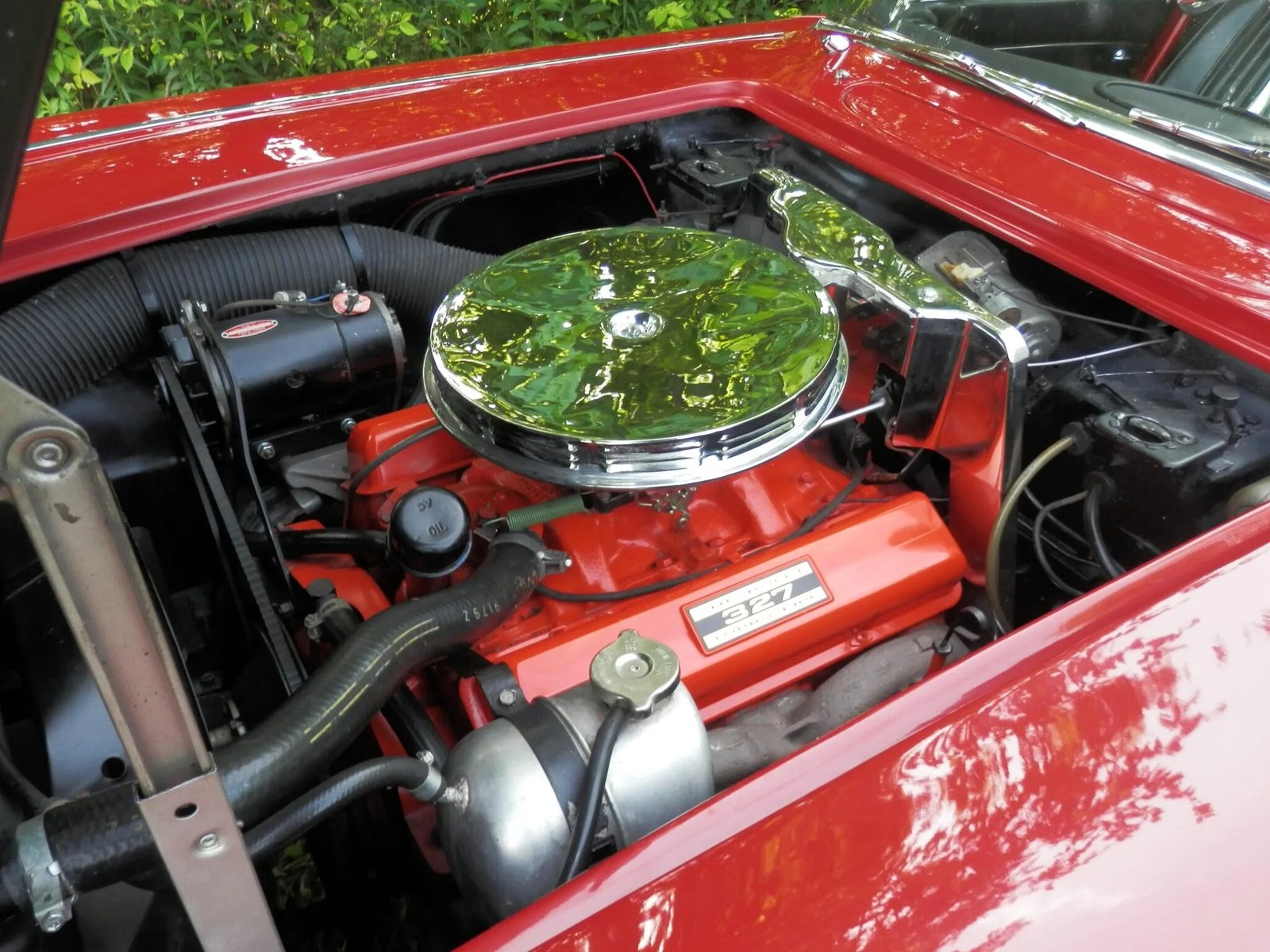 The 327ci Turbo-Fire V8 breathes through a four-barrel carburetor and features a polished air cleaner lid and ignition cover. The carburetor have been rebuilt and the generator, fuel pump, and starter were replaced. The engine was rebuilt, and the engine stamp pad was machined. Power is delivered to the rear wheels through a four-speed manual transmission and a 3.08:1 Positraction rear axle.