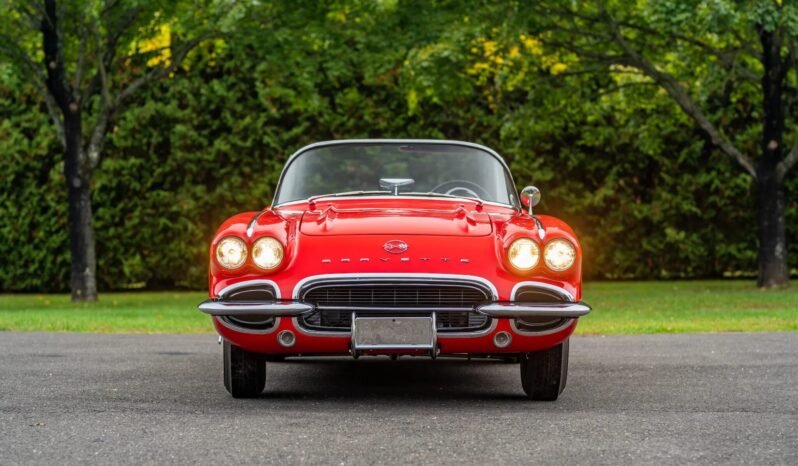 This 1962 Chevrolet Corvette was acquired by the seller in 1997 and was subsequently re-bodied and refurbished by Twin Brook Restoration in 2001. The car is finished in red with matching coves over black vinyl upholstery and power is provided by a Rochester fuel-injected 327ci V8 mated to a four-speed manual transmission. Equipment includes a white convertible top, a body-colored hardtop, heavy-duty drum brakes, 15″ wheels with spinner-style covers, BFGoodrich whitewall tires, a Harrison aluminum radiator, a dual exhaust system, and a Wonder Bar AM radio.