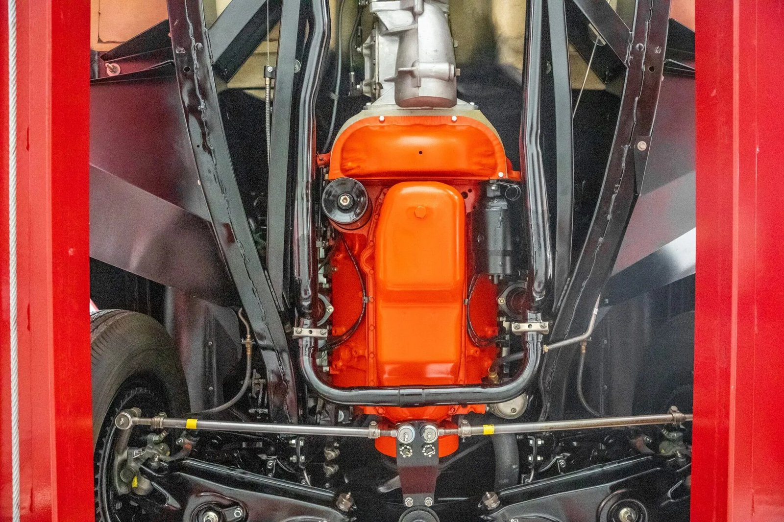 The 327ci V8 was rebuilt by L&L Auto Machine Service in 2001 and features a Rochester mechanical fuel-injection system, Corvette-script valve covers, a polished ignition cover, and a Harrison aluminum radiator. The fuel injection system was rebuilt by Jack Podell Fuel Injection in 2022. Power is delivered to the rear wheels through a four-speed manual transmission.