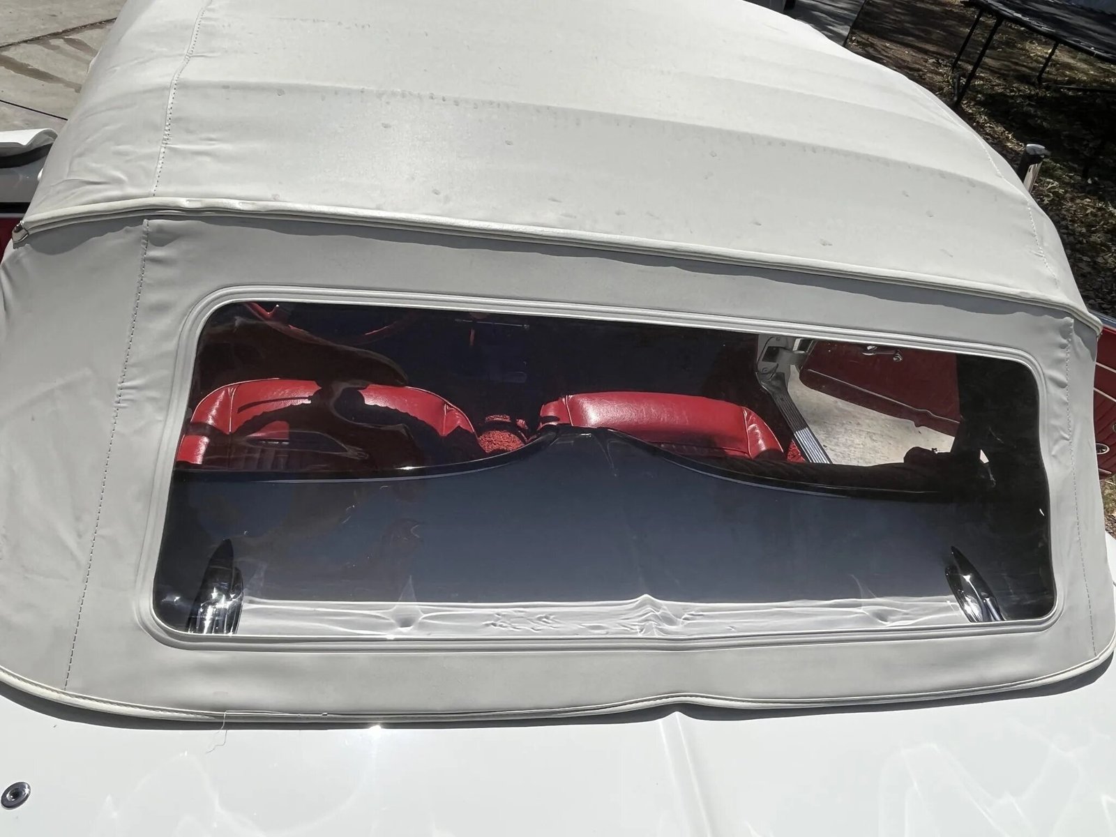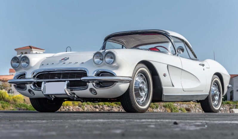 Power comes from a replacement 327ci V8 paired with a four-speed manual transmission, and the car is finished in white with a body-color removable hardtop over red vinyl upholstery.