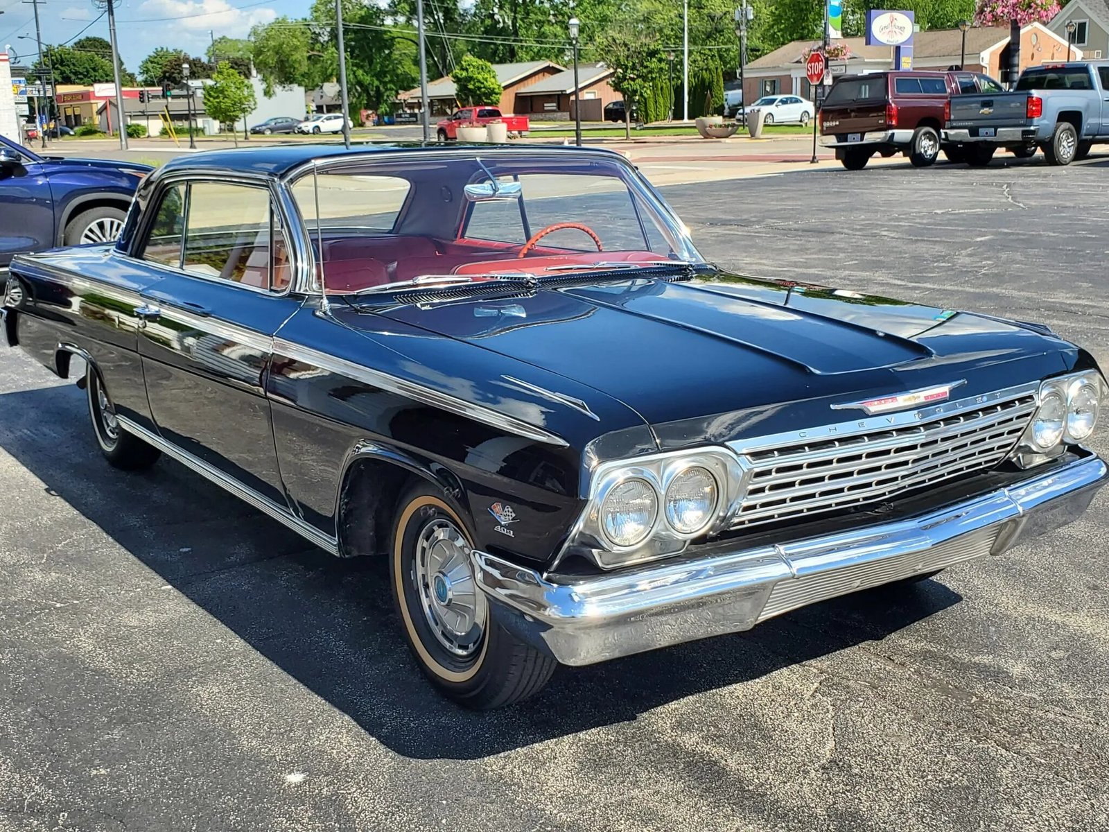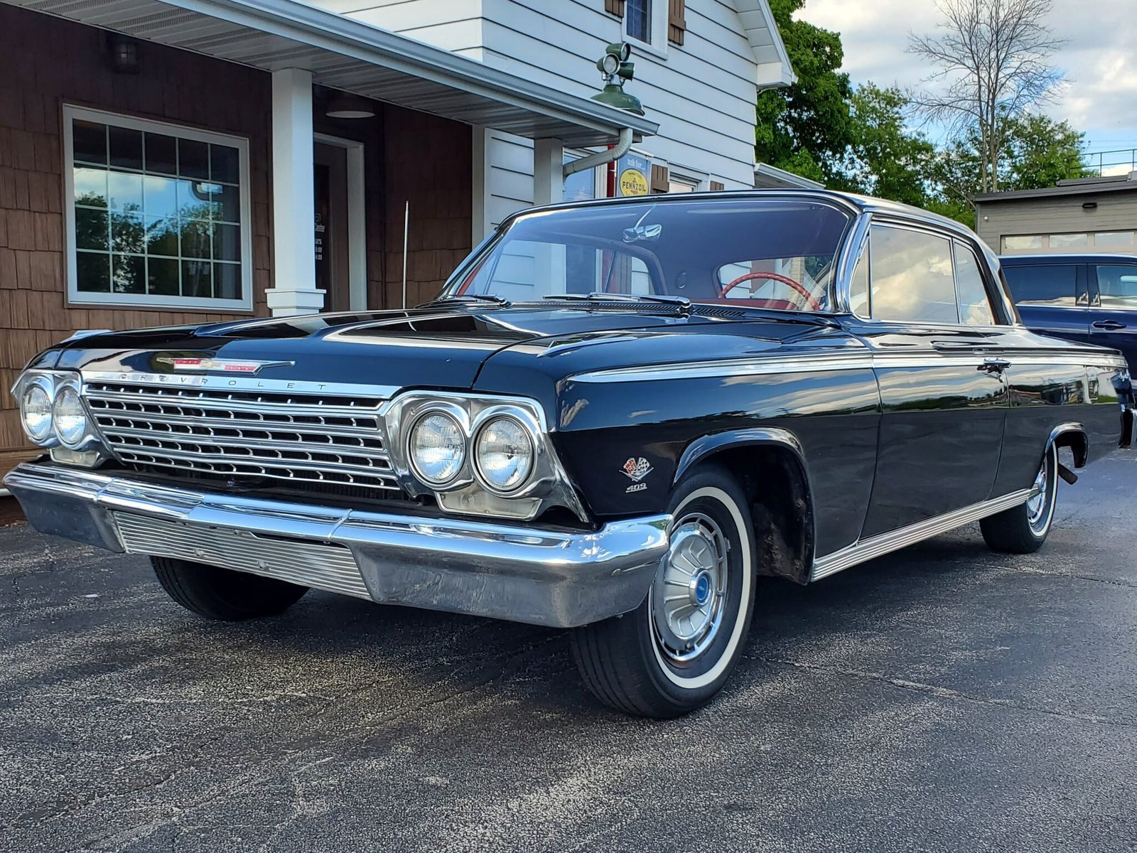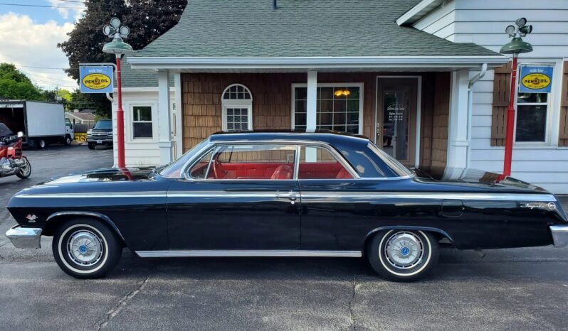 This 1962 Chevrolet Impala Sport Coupe was sold new at Broadway Garage of De Pere, Wisconsin in May 1962. The car is finished in black over red and powered by a 409ci V8 paired with a four-speed manual transmission. Equipment includes a front bench seat, heater and defroster, 14″ steel wheels with turbine-style covers, narrow whitewall tires, a dual exhaust system, and a push-button AM radio. Subsequent work have consisted of rebuilding both four-barrel carburetors.