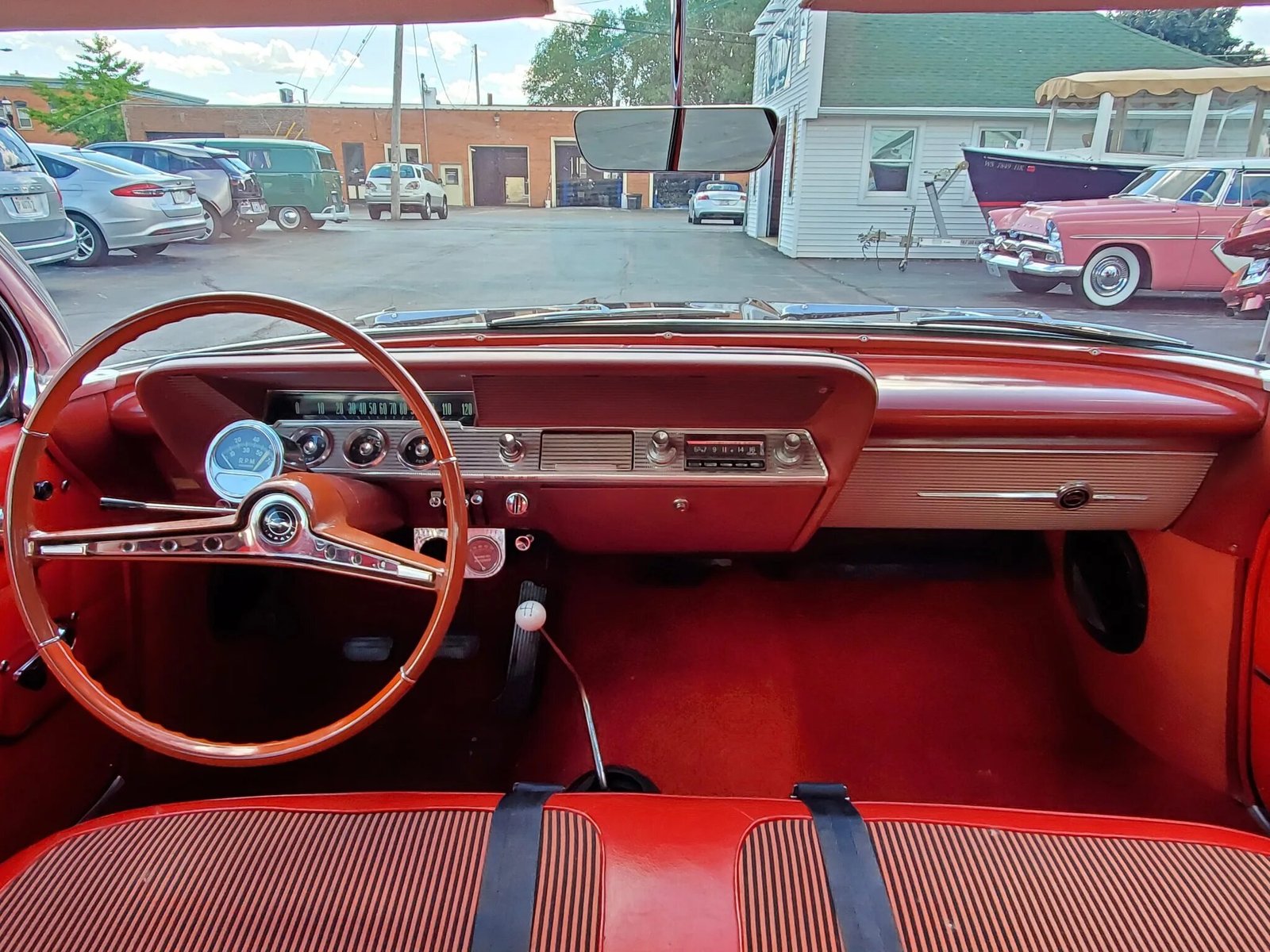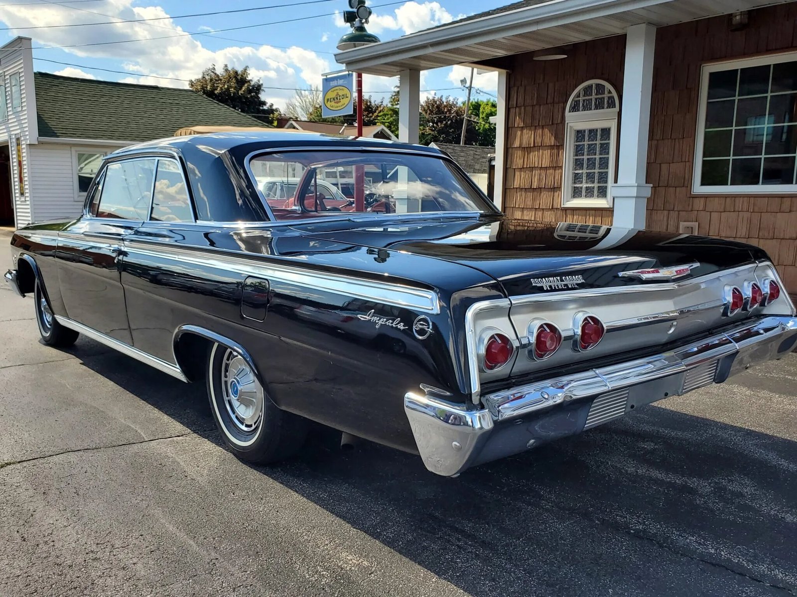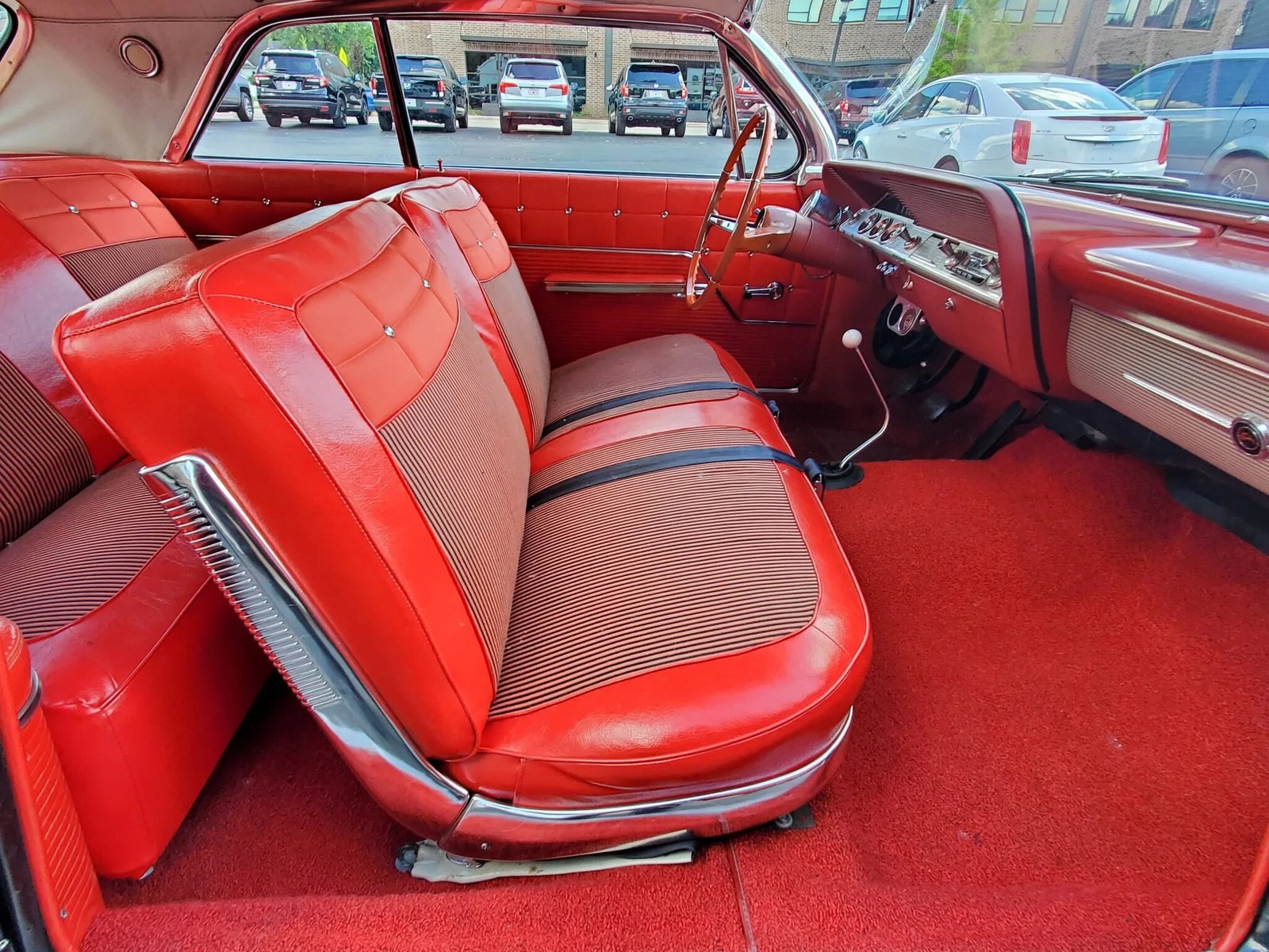 This 1962 Chevrolet Impala Sport Coupe was sold new at Broadway Garage of De Pere, Wisconsin in May 1962. The car is finished in black over red and powered by a 409ci V8 paired with a four-speed manual transmission. Equipment includes a front bench seat, heater and defroster, 14″ steel wheels with turbine-style covers, narrow whitewall tires, a dual exhaust system, and a push-button AM radio. Subsequent work have consisted of rebuilding both four-barrel carburetors.