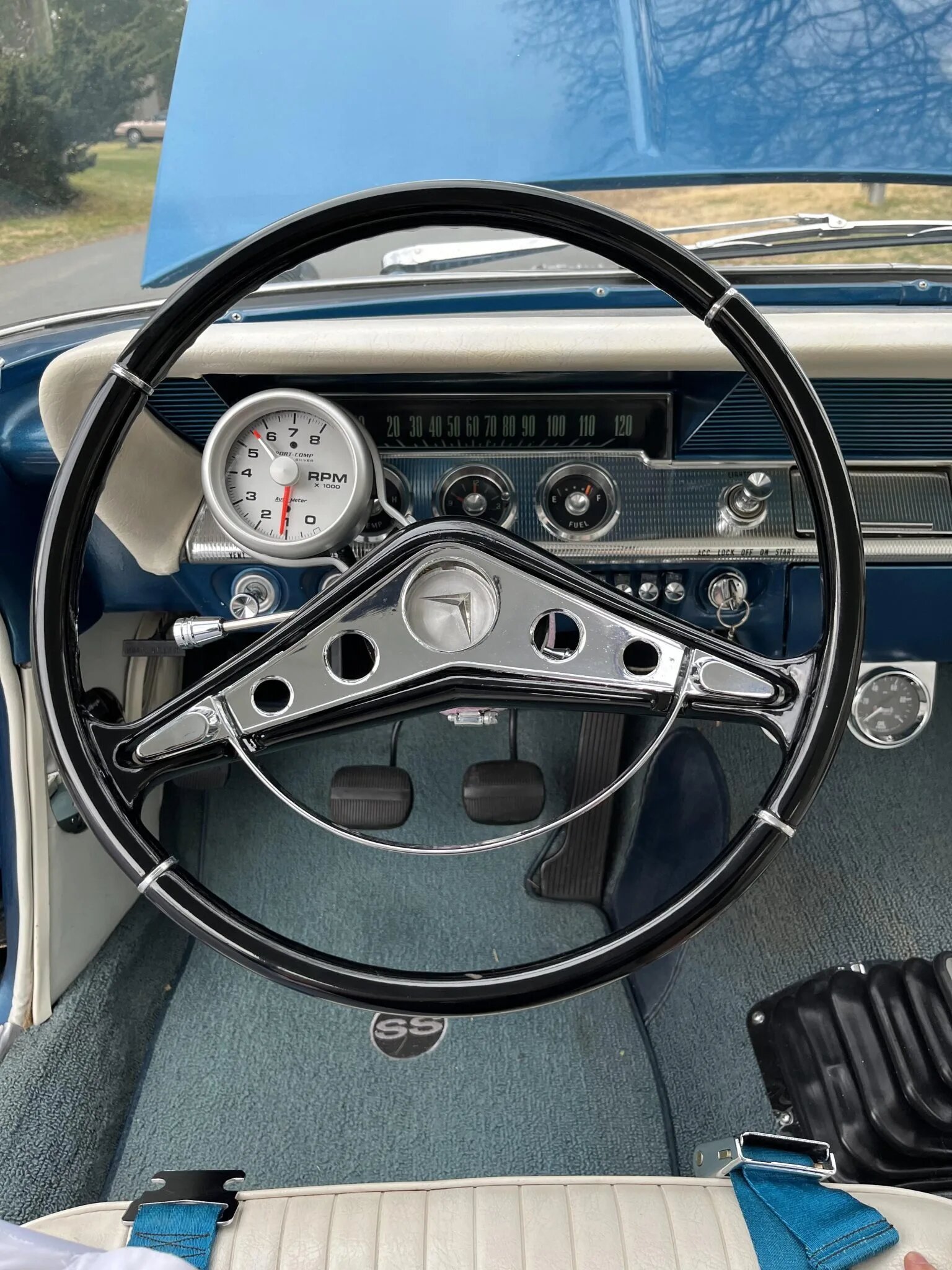 An aftermarket tachometer is mounted to the steering column, and Summit oil pressure and coolant temperature gauges are mounted under the dash.