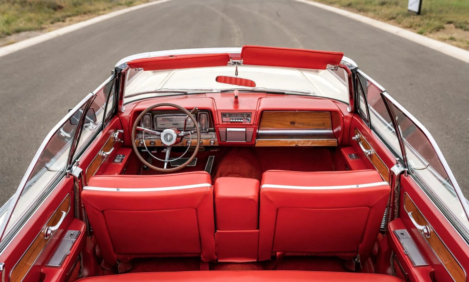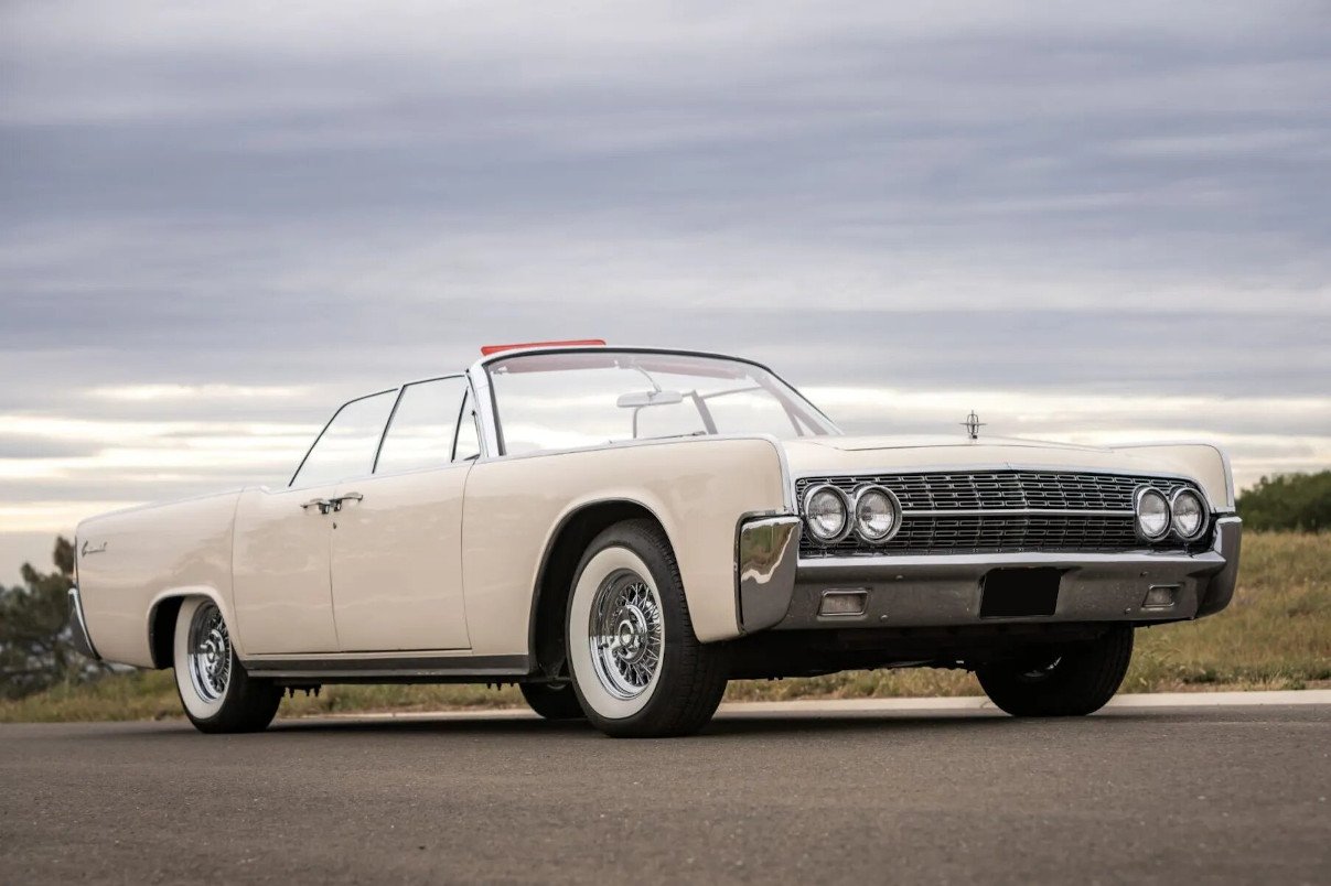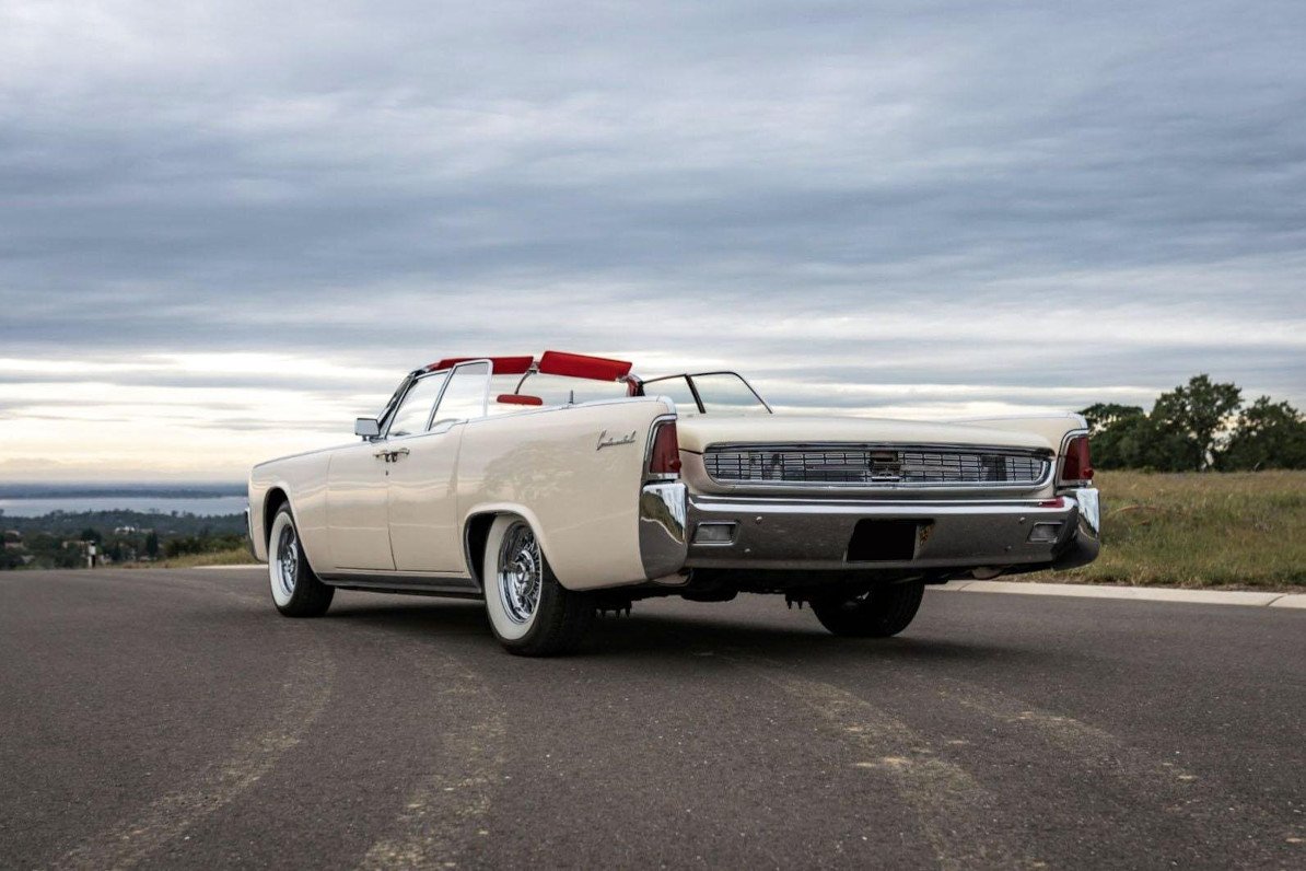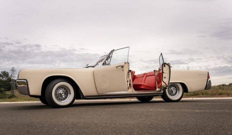 This 1962 Lincoln Continental convertible was produced in October 1961. Finished in white over a red interior, the car is powered by a 430ci V8 mated to an automatic transmission. Features include a power-operated convertible top, a push-button radio, and 15″ wire wheels.