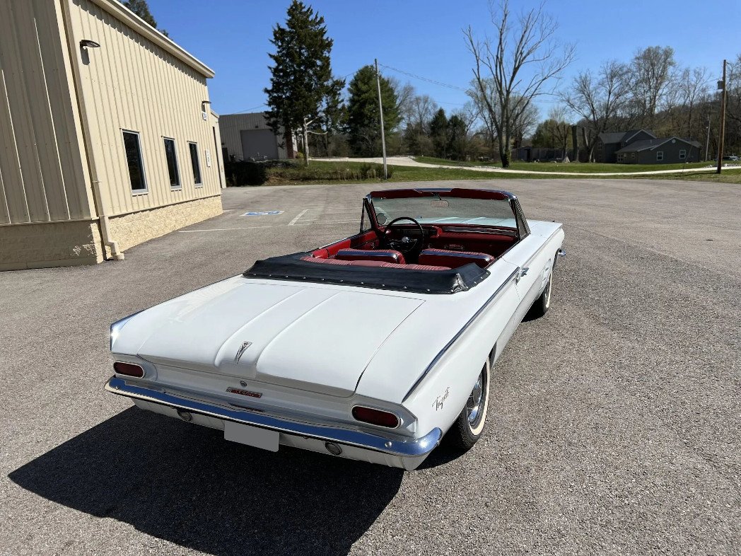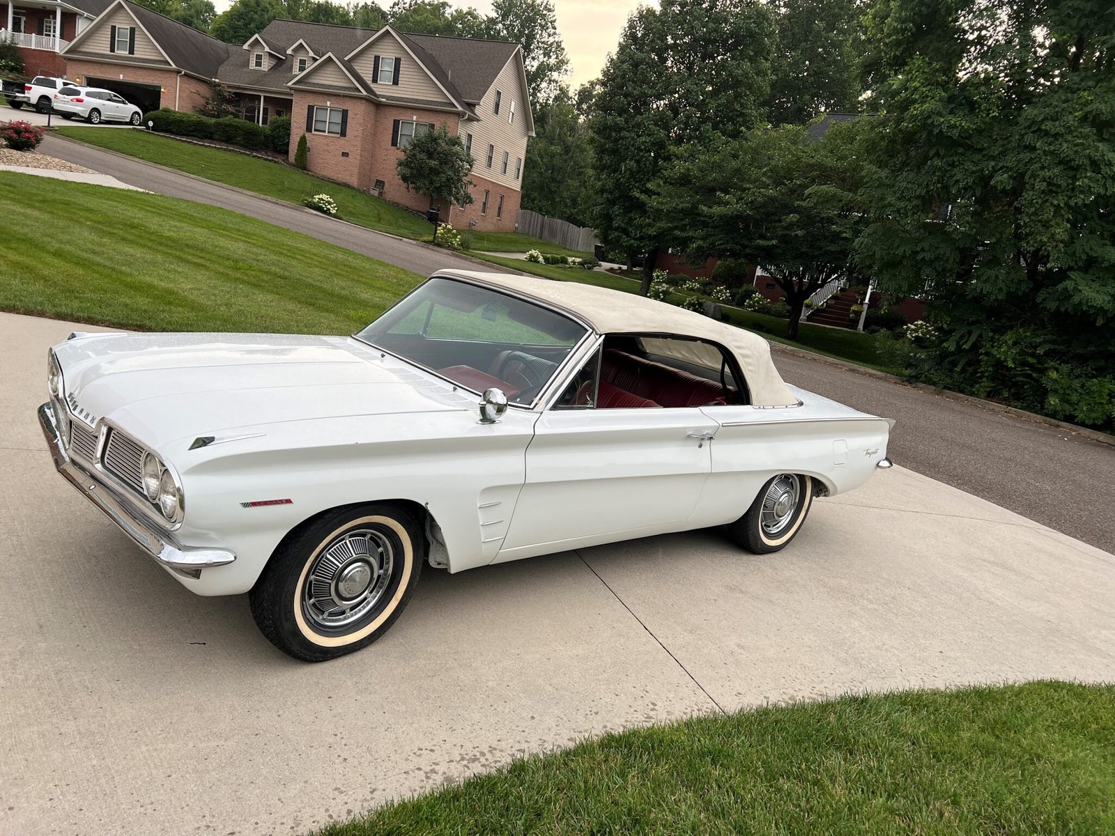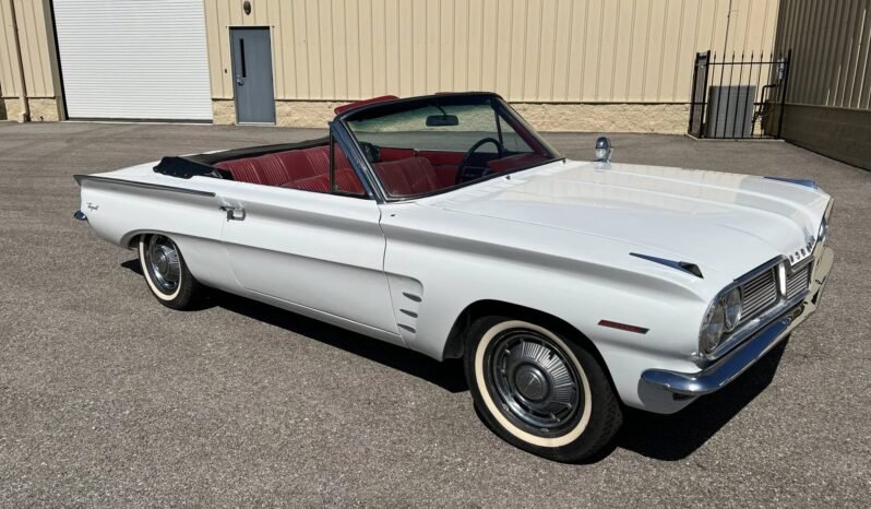 This 1962 Pontiac Tempest LeMans convertible is finished in white over red vinyl and is powered by a 195ci inline-four mated to a two-speed automatic transaxle.