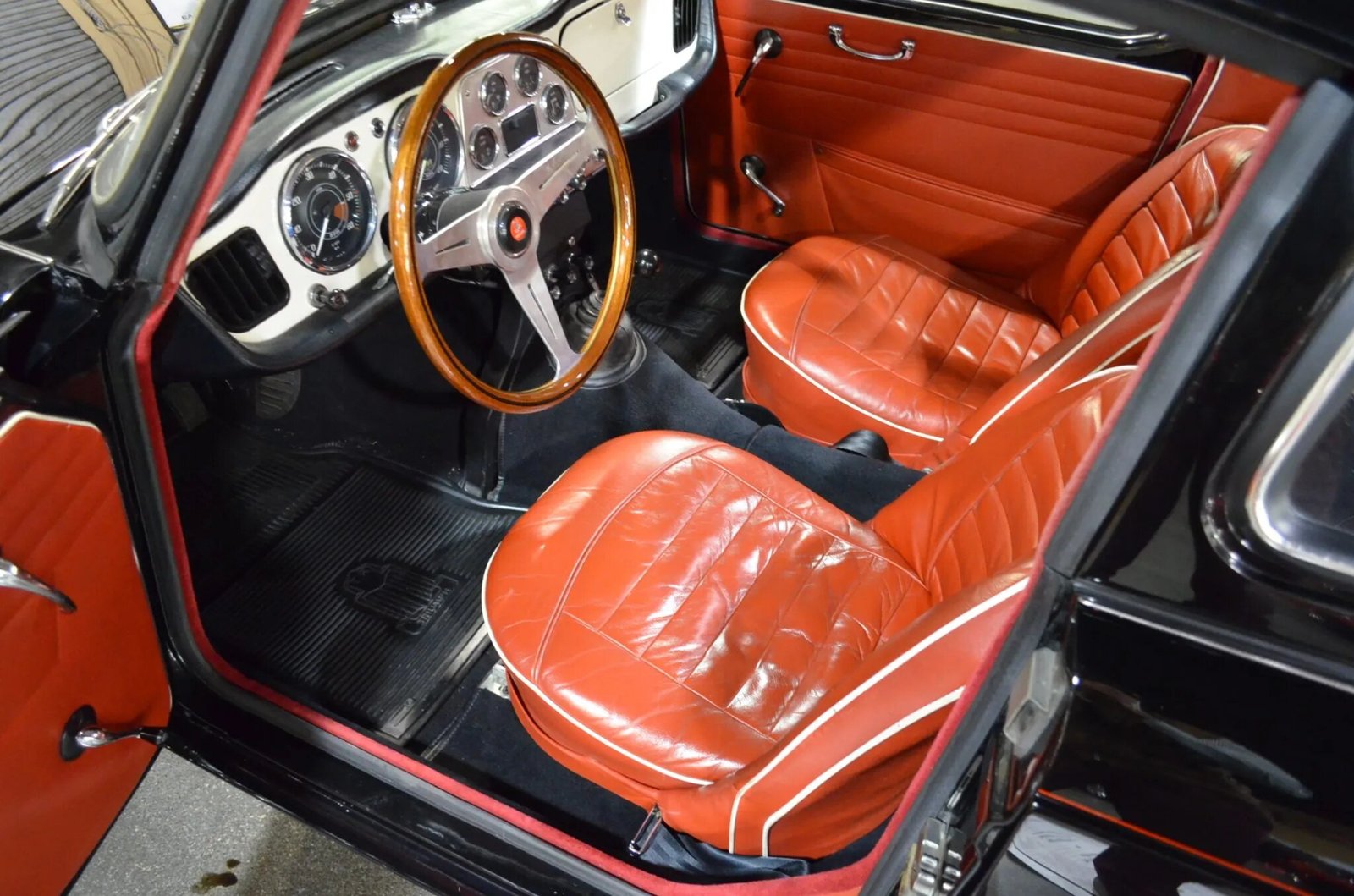 The seats were reupholstered in red leather with white piping during the refurbishment, and additional details include black carpets, Triumph-branded rubber mats, and lap belts.