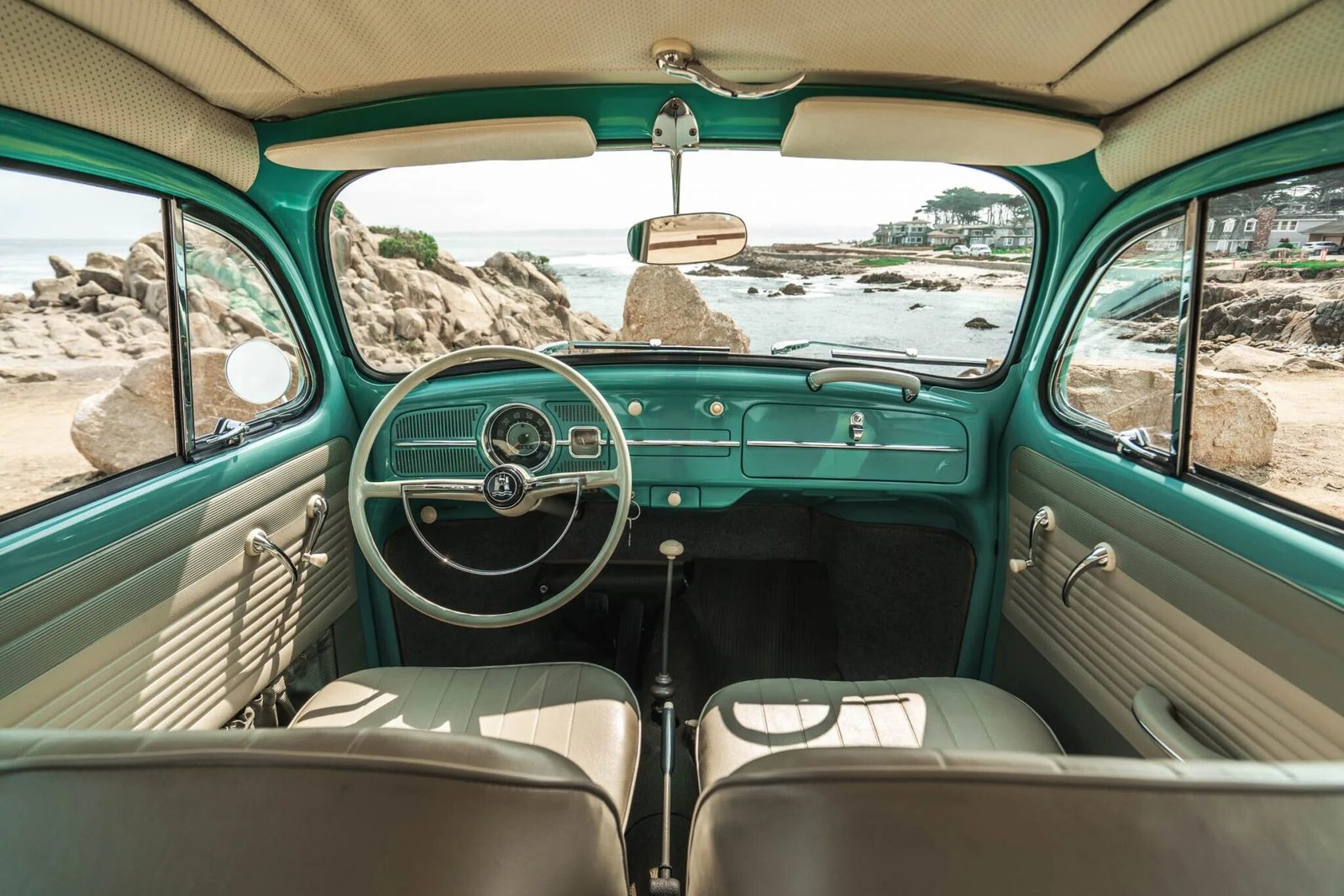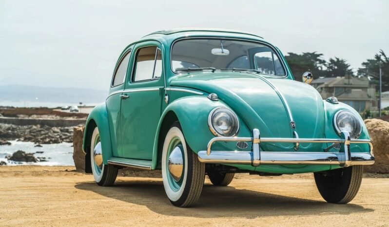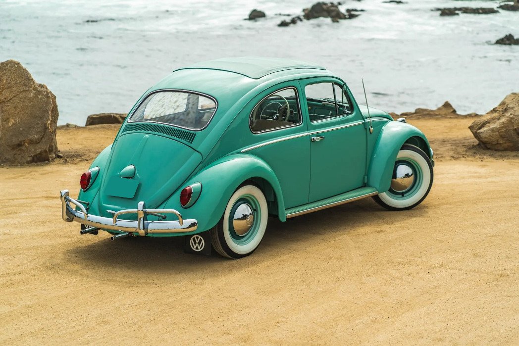 The car was refinished, reportedly in the original turquoise (L380), and it features a sunroof with a matching vinyl cover, running boards, Volkswagen-branded rear mud flaps, and chrome bumpers and trim.