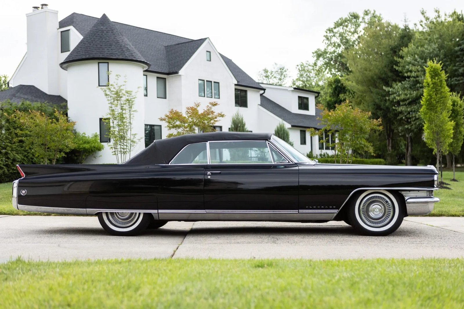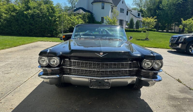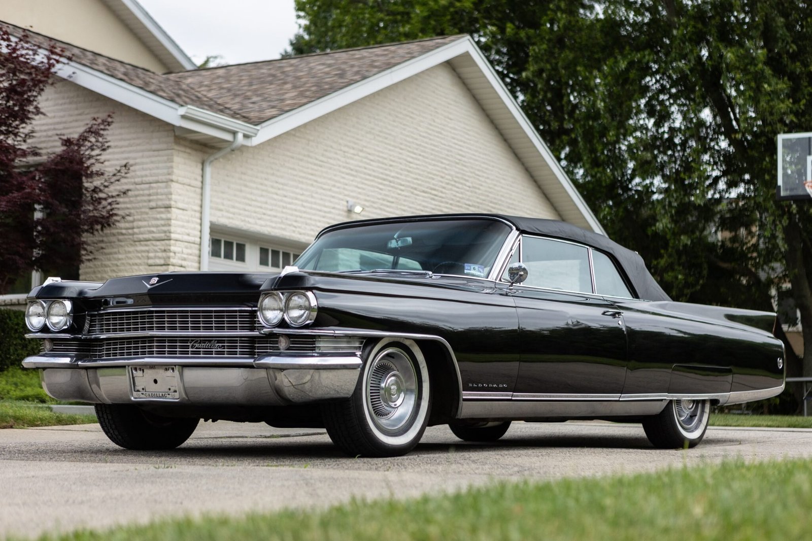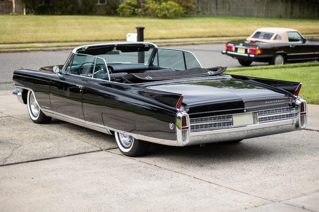 This Cadillac Eldorado Biarritz convertible is one of 1,825 produced for the 1963 model year. The triple-black convertible is powered by a 390ci V8 paired with a four-speed automatic transmission. Equipment includes a power-operated black convertible top, power-assisted steering, chrome bumpers, bright trim, tailfins, fender skirts, air conditioning, a six-way power-adjustable front seat, power windows and door locks, and a push-button AM/FM radio.