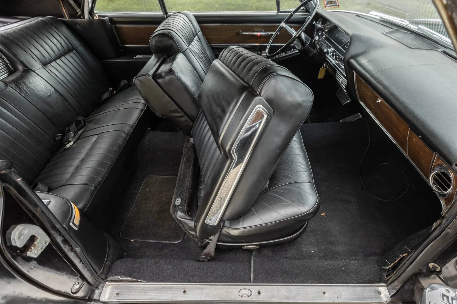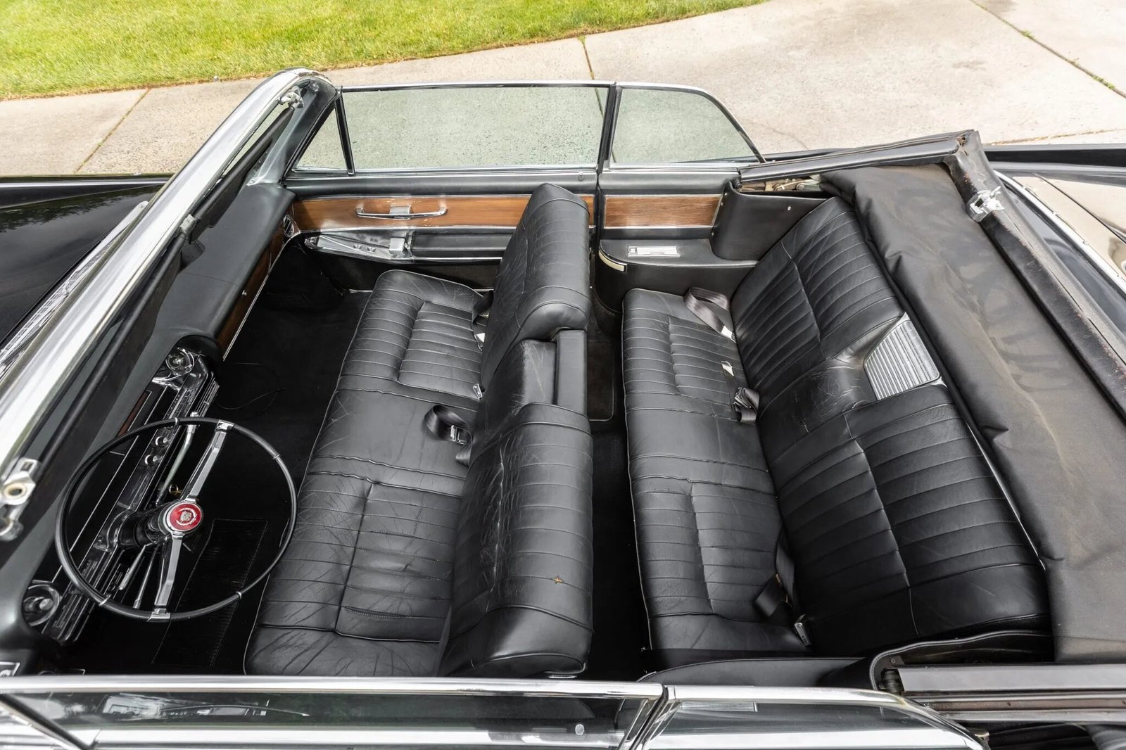 The cabin features front and rear bench seats trimmed in black leather, and the padded dashboard and door panels are accented with wood veneers and chrome trim.