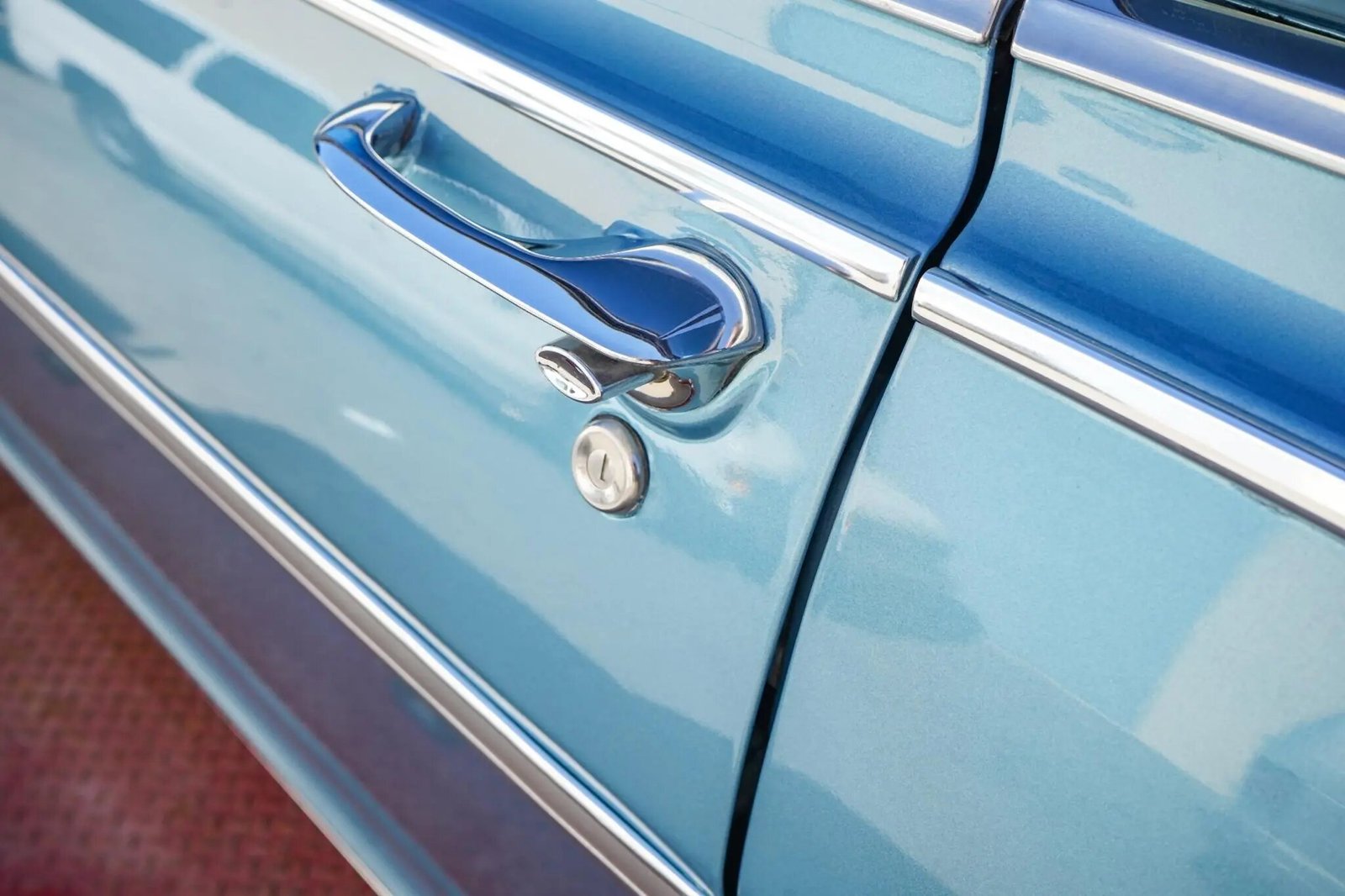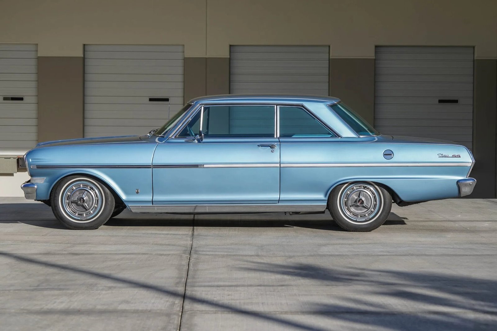 The car was refinished in its factory Silver Blue, and features chrome bumpers, a polished side mirror, body-side moldings, rocker trim, a silver rear fascia, and Nova SS badging on the rear quarter panels and trunk lid.