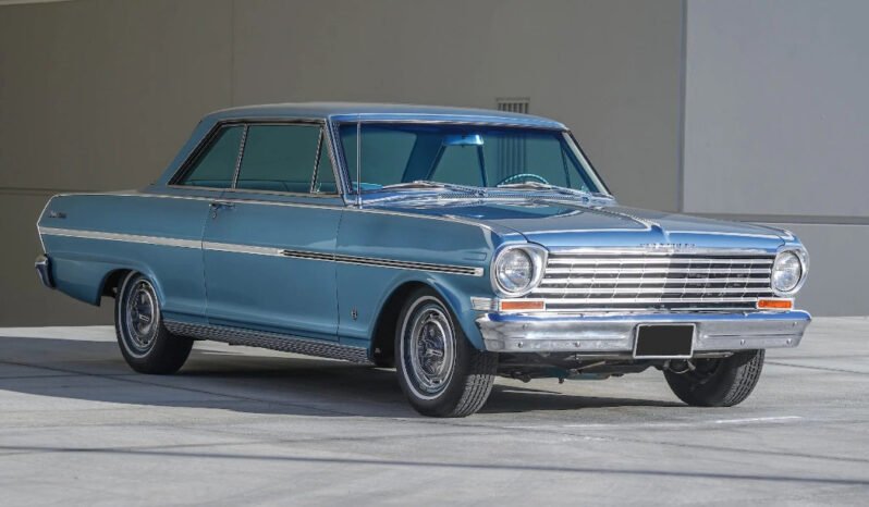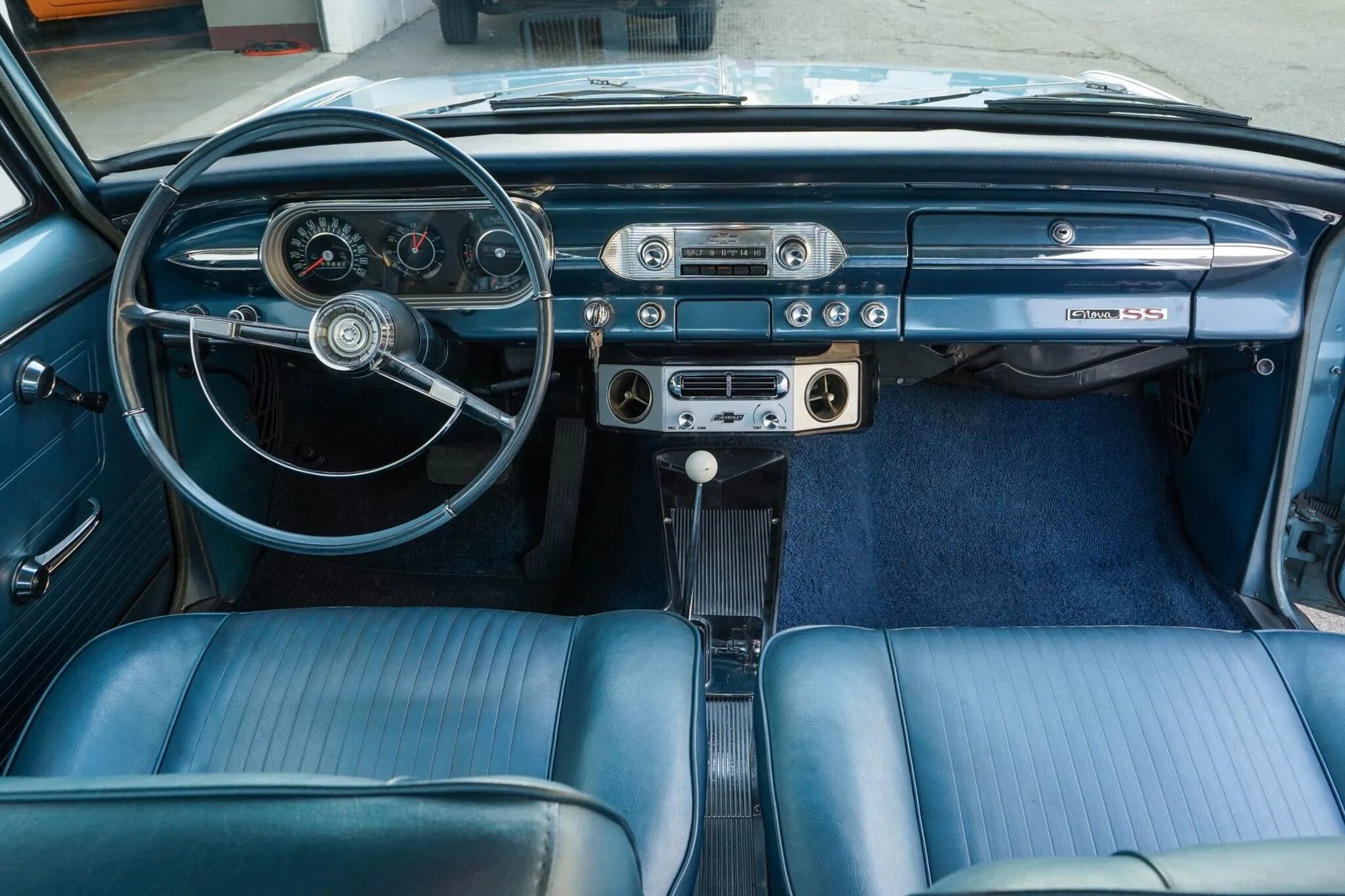 This 1963 Chevrolet Chevy II Nova SS sport coupe is finished in Silver Blue over blue vinyl and powered by a 194ci inline-six paired with a two-speed Powerglide automatic transmission.