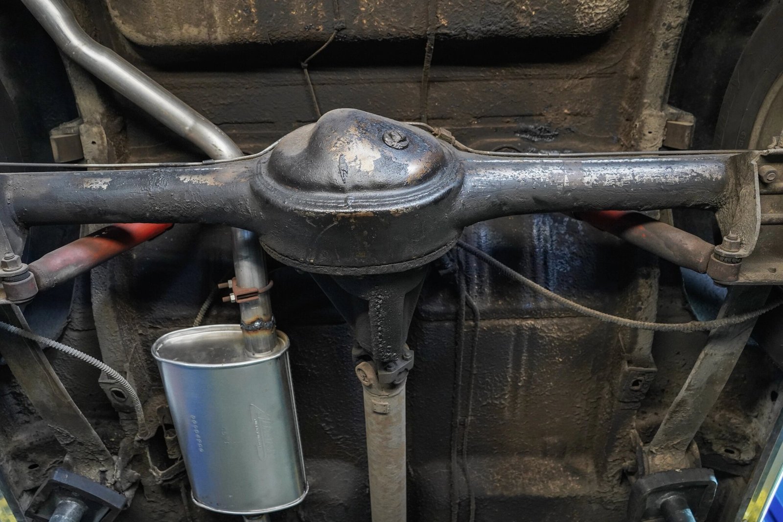 The car is equipped with power steering, and braking power is supplied by unassisted drums at all four corners that have been serviced earlier in preparation for sale.