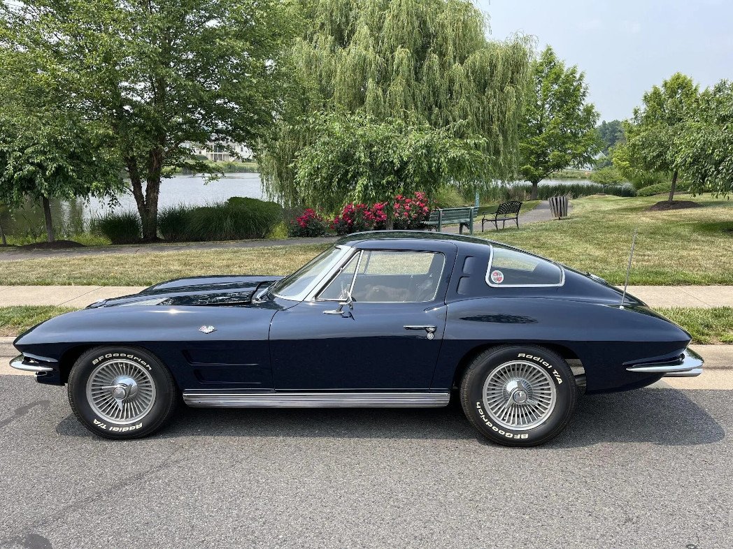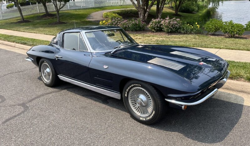 This 1963 Chevrolet Corvette split-window coupe is powered by a 327ci V8 paired with a four-speed manual transmission. An Edelbrock intake, carburetor, and air cleaner are fitted. The car is finished in dark blue over matching vinyl and equipped with 15″ turbine-style wheels, concealed headlights, and a Kenwood CD stereo mounted in the jack-storage compartment.