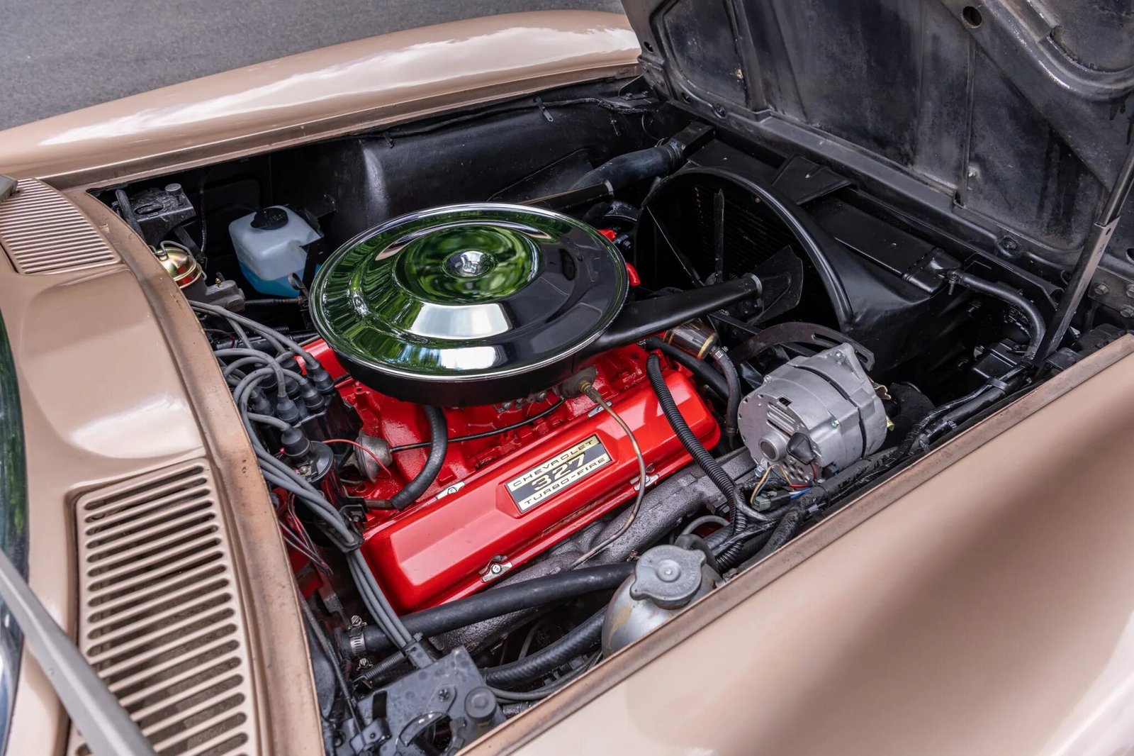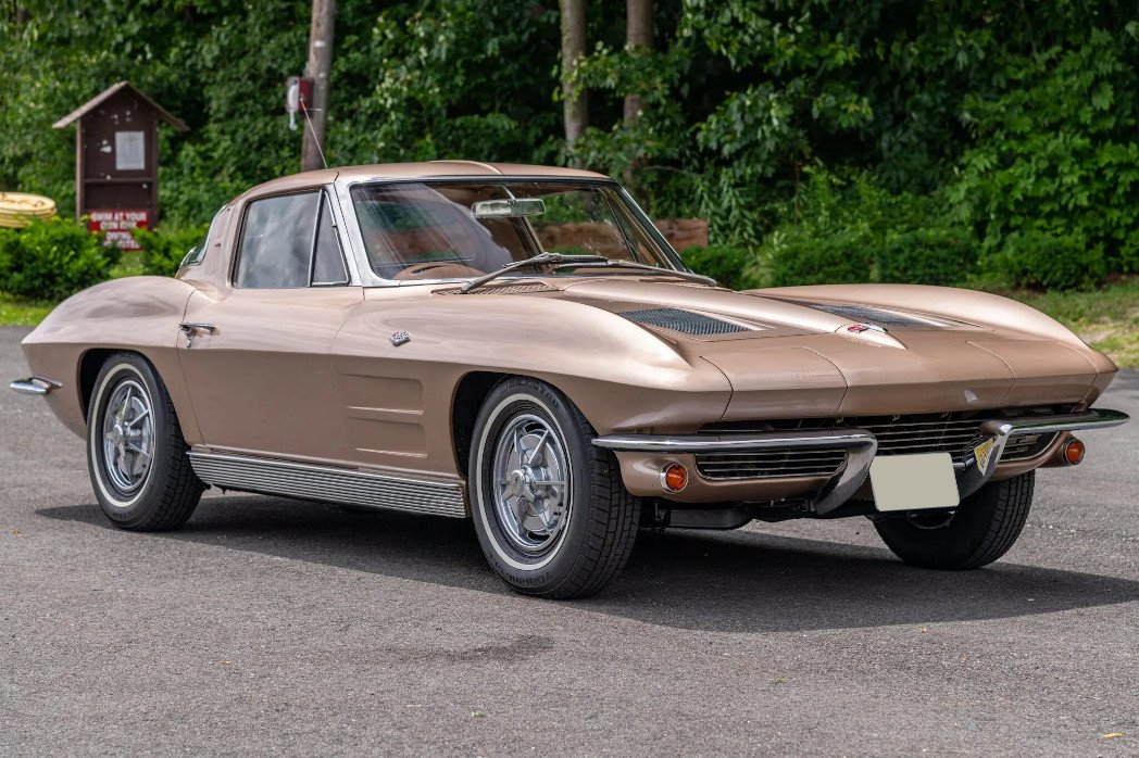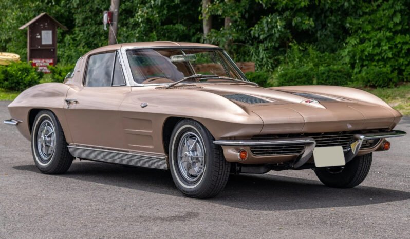 This 1963 Chevrolet Corvette is a tan split-window coupe that is powered by a 327ci V8 paired with a four-speed manual transmission.