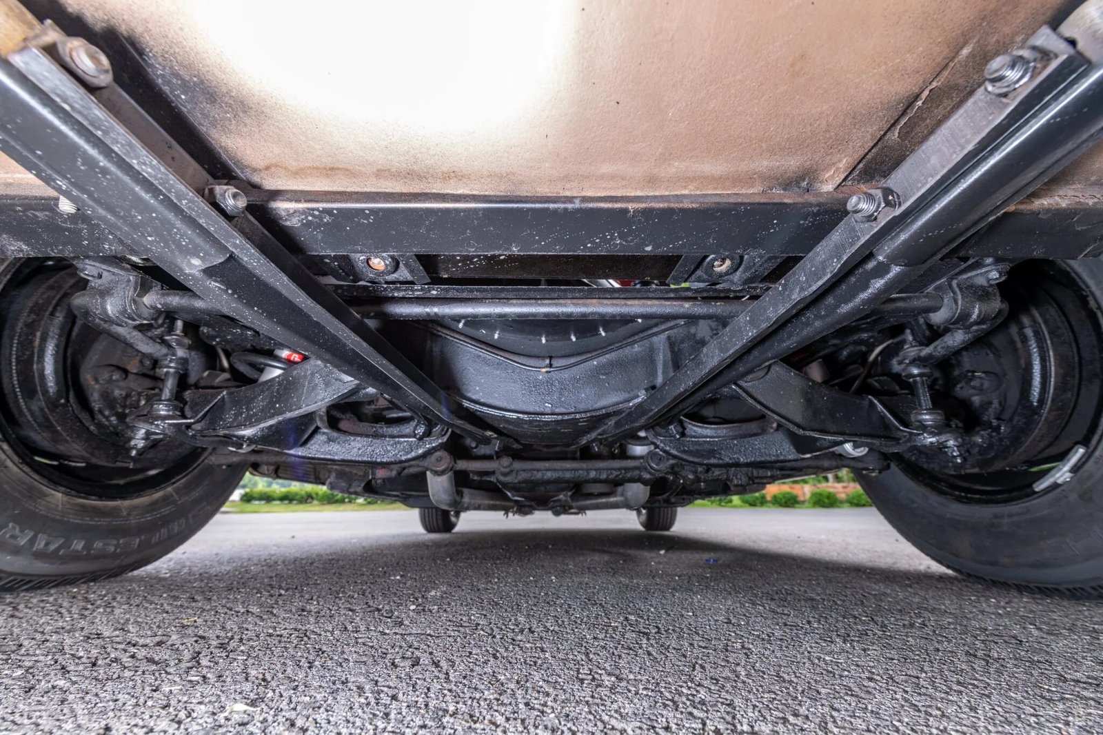 Steel 15″ wheels wear spinner-style covers and are mounted with 205/75 Milestar Touring SLE whitewall tires in preparation for sale.