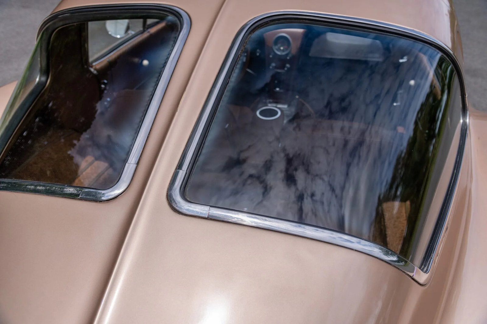 Features include a split rear window, a driver-side mirror, fender and B-pillar scallops, chrome rocker panel trim and bumpers, flip-up headlamps, and a dual exhaust system that exits through the rear valance.