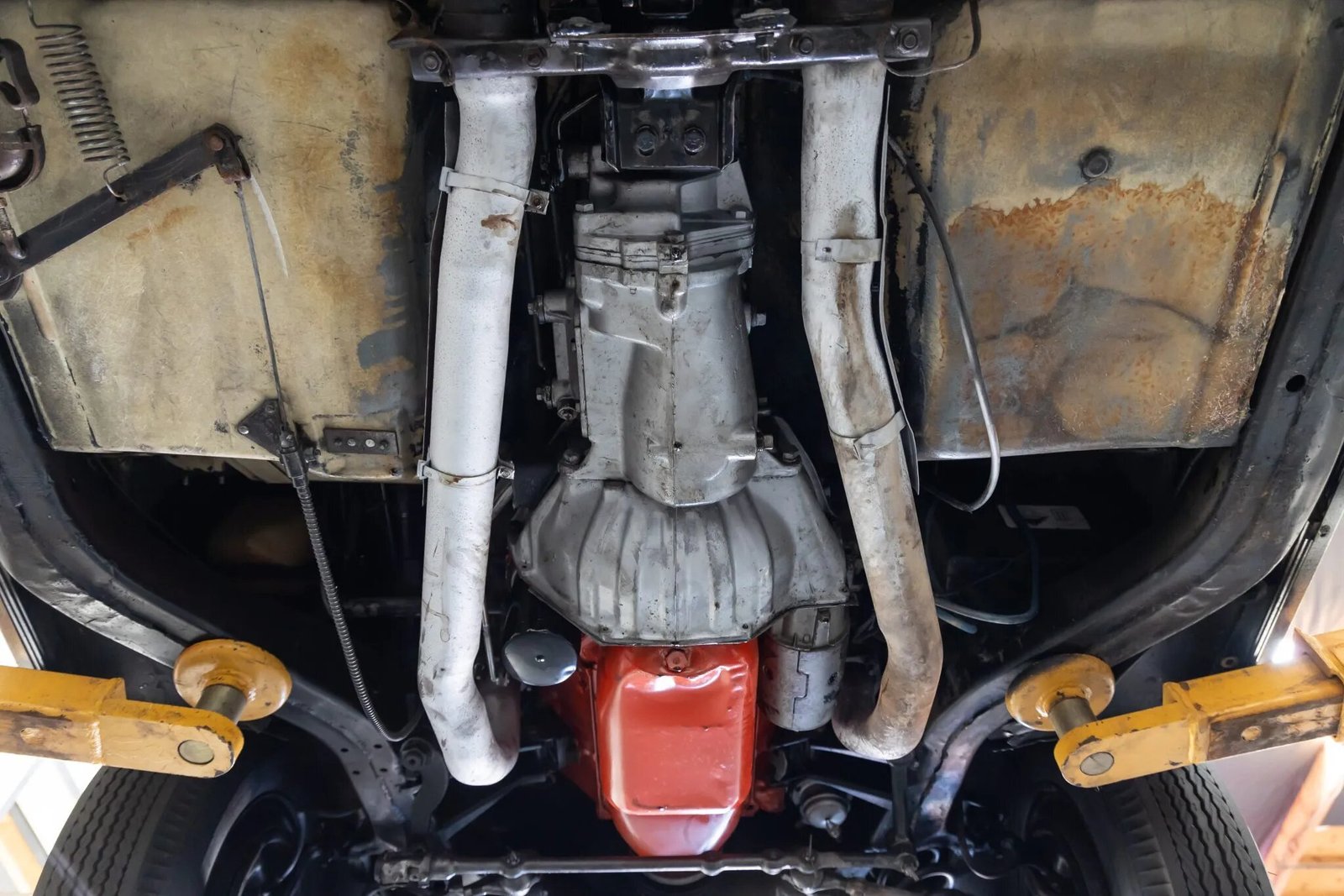 Power is sent to the rear wheels through a four-speed manual transmission. Service in preparation for sale involved resurfacing the flywheel and replacing the clutch.