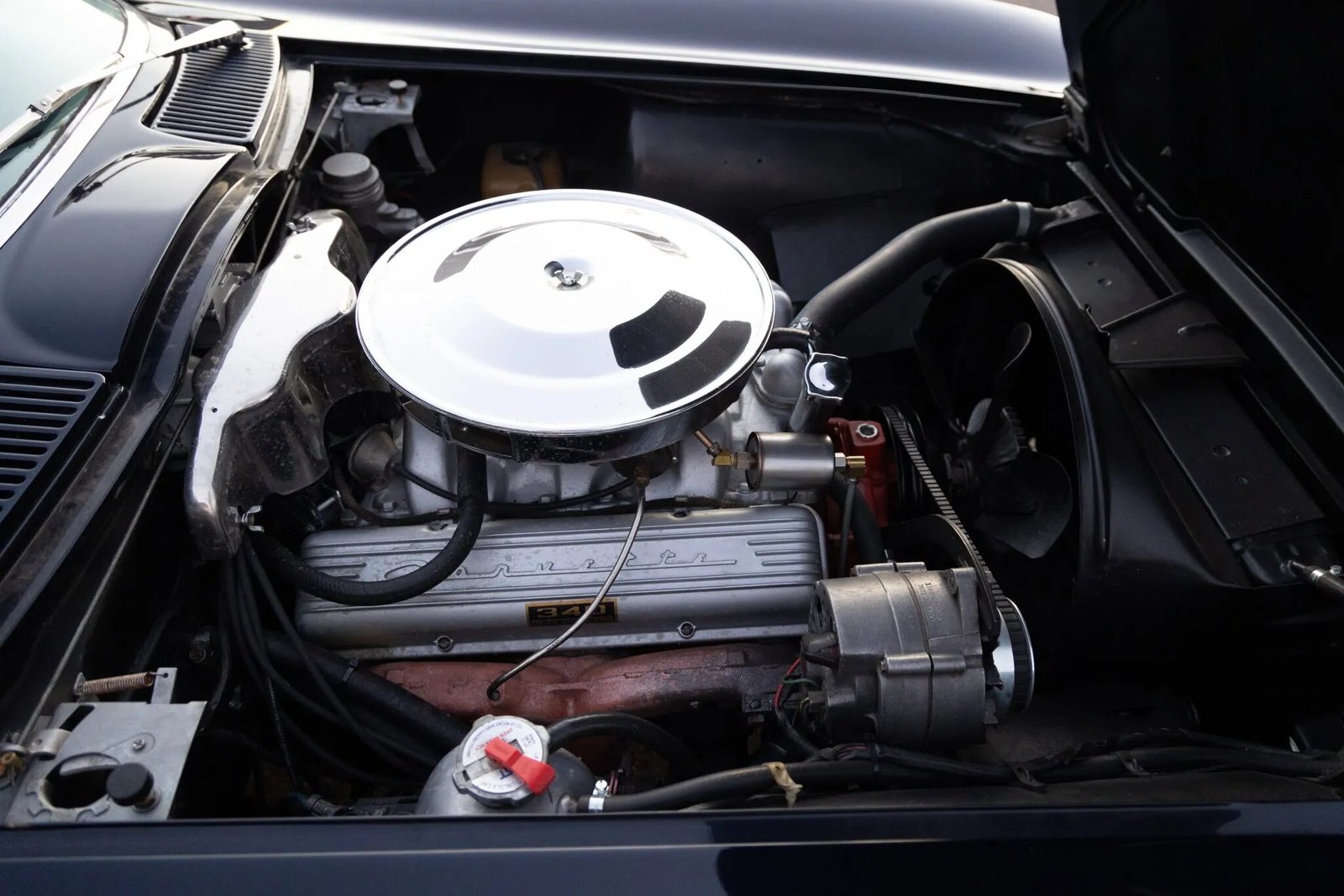 The 327ci L76 V8 was equipped from the factory with a single four-barrel carburetor and a high-lift camshaft for a factory rating of 340 horsepower. Service in preparation for sale included an oil change, coolant flush, and replacing the fuel pump, fuel filter, heater hose, and mufflers.
