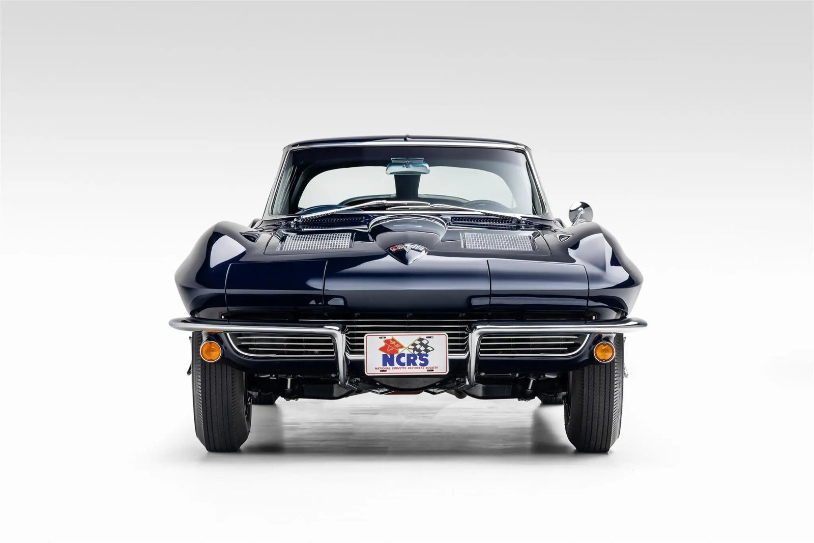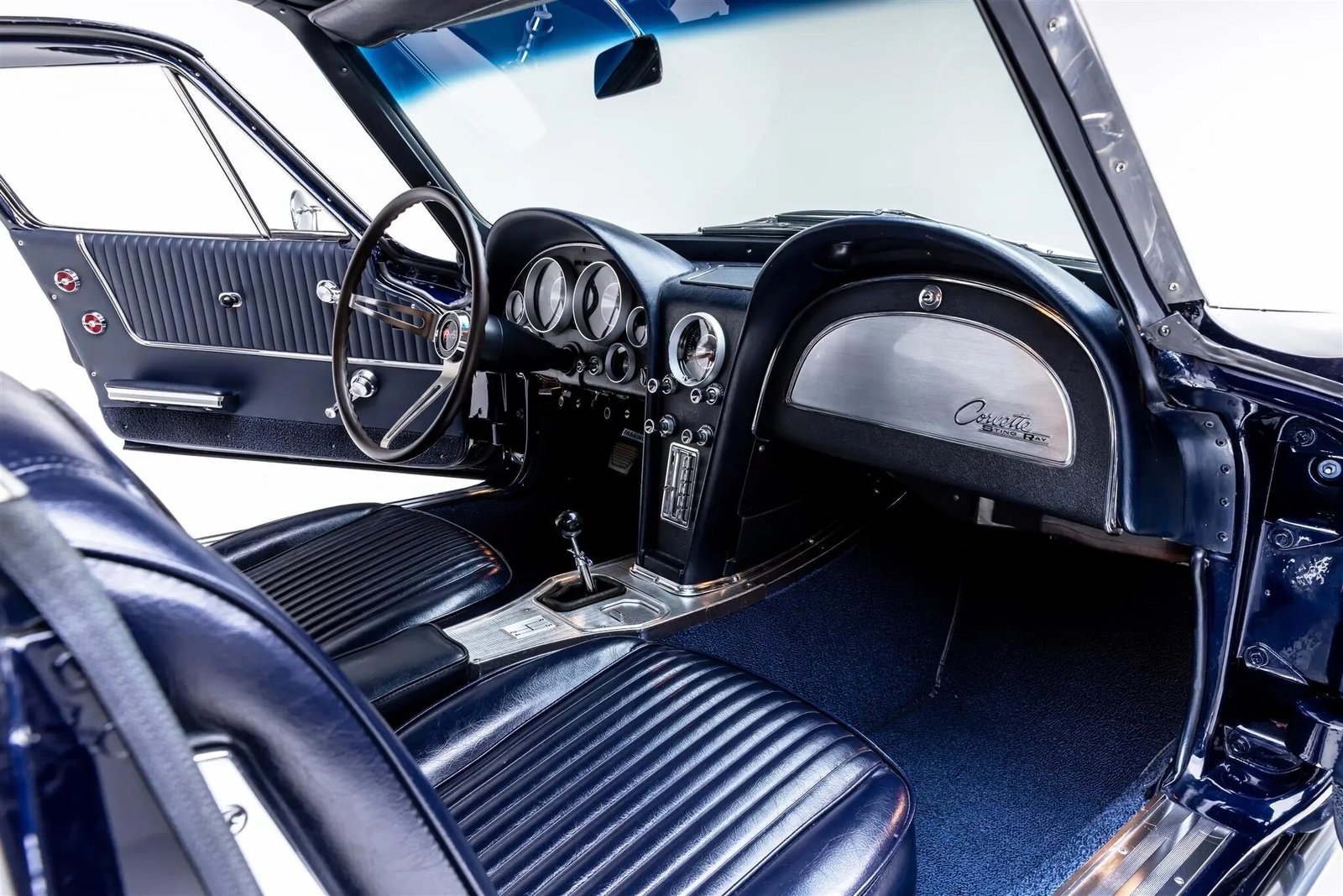 The fiberglass body left the factory finished in Daytona Blue (916) and was refinished. Equipment includes flip-up headlamps, fender vents, quad tail lamps, chrome bumperettes, and dual exhaust tips that exit through the rear valance.