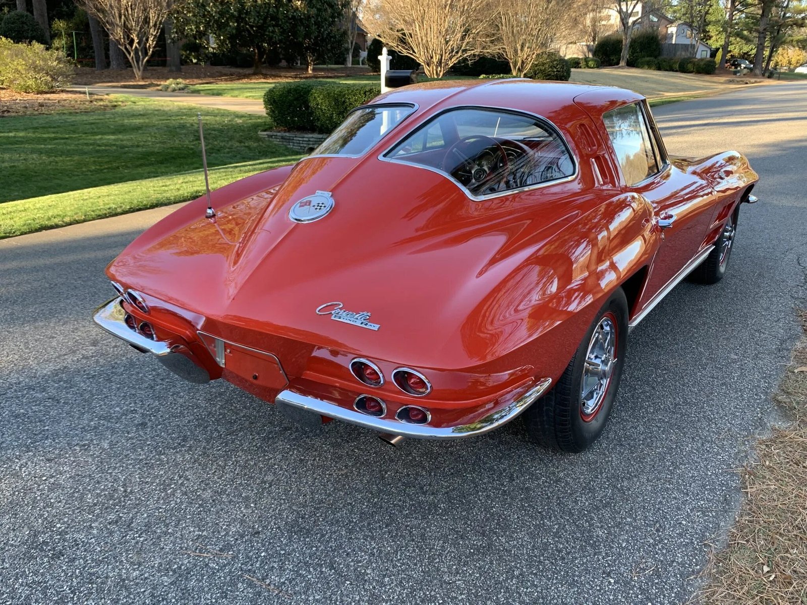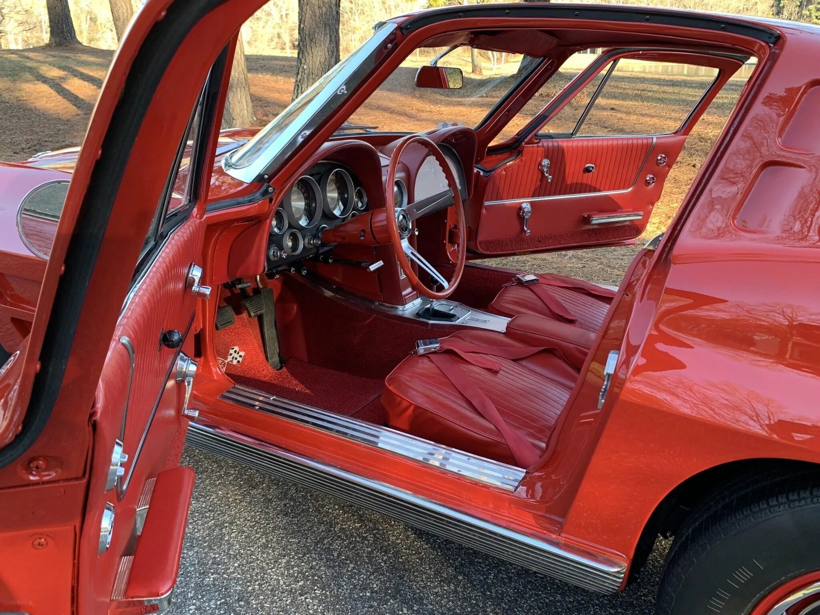 This 1963 Chevrolet Corvette split-window coupe is finished in red over red vinyl upholstery and powered by a numbers-matching 327ci V8 paired with a four-speed manual transmission.