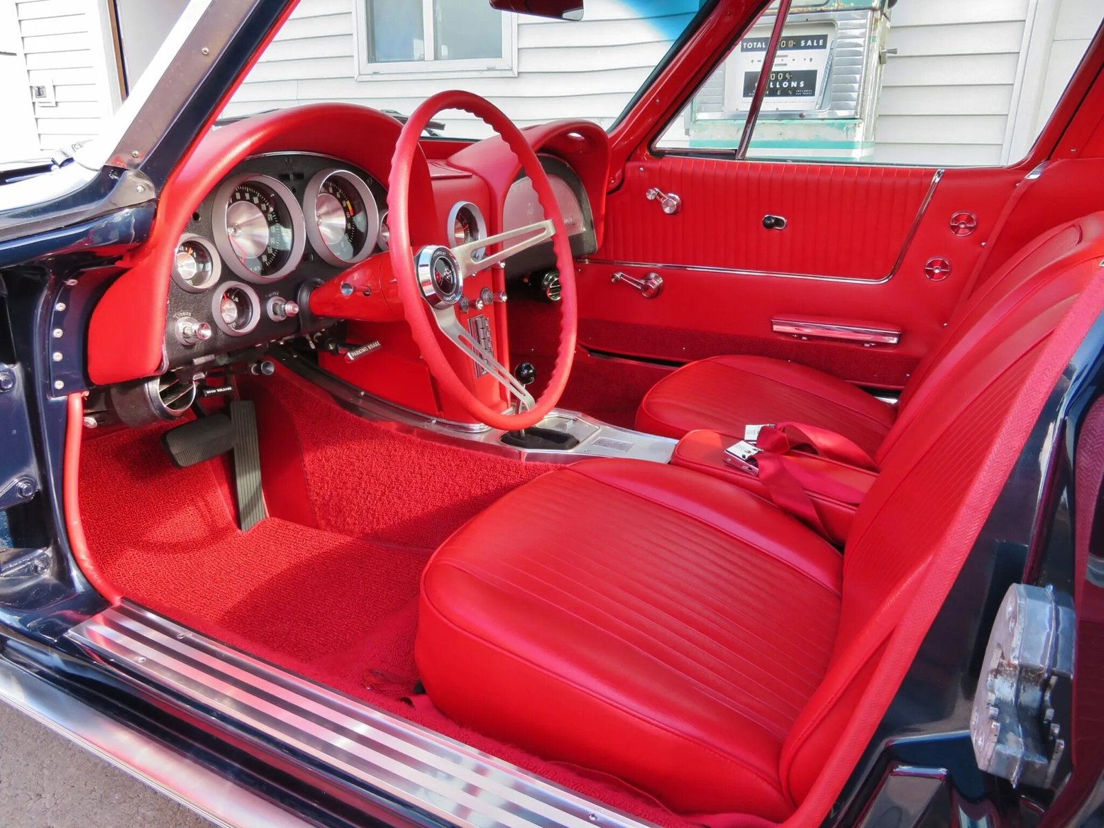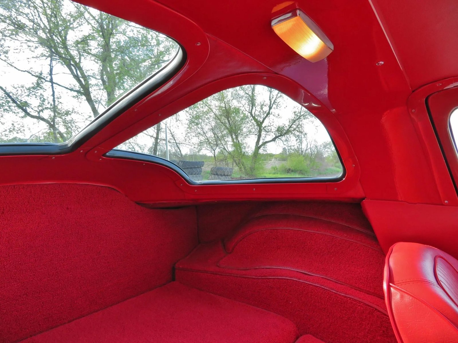 The cabin was reupholstered in the factory red vinyl in 2007. The carpets, seat covers, door panels, armrests, and steering wheel were replaced. Amenities include aftermarket R134a air conditioning, a heater, an AM radio, and lap seatbelts.