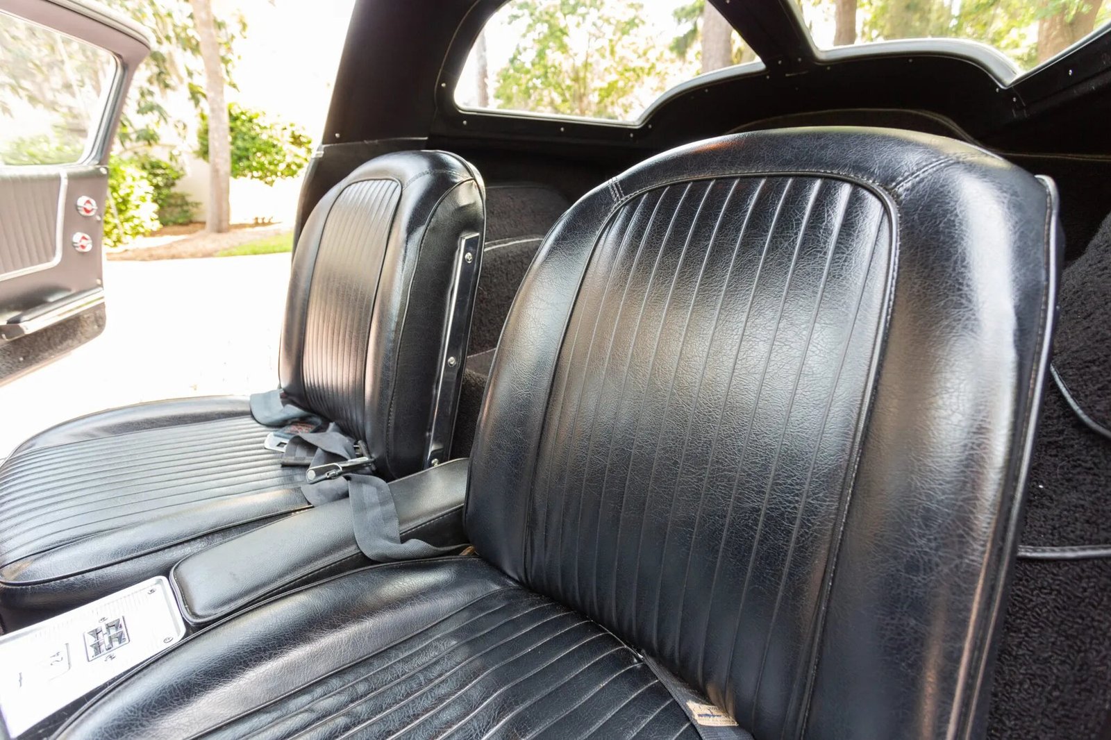 The cabin houses two bucket seats upholstered in black vinyl along with color-coordinated door panels and carpets. Appointments include a heater, an AM/FM radio, power windows, and lap belts.