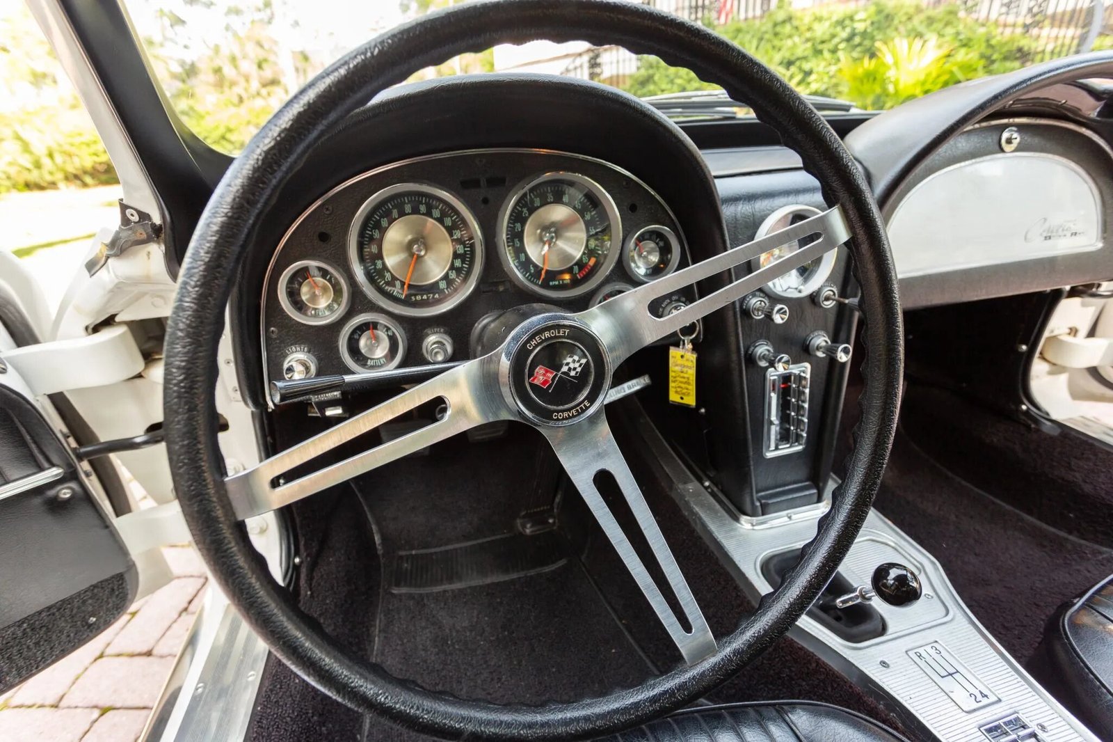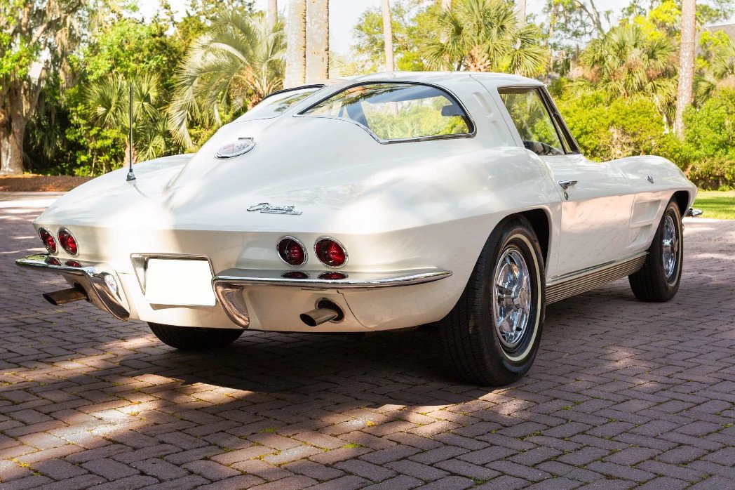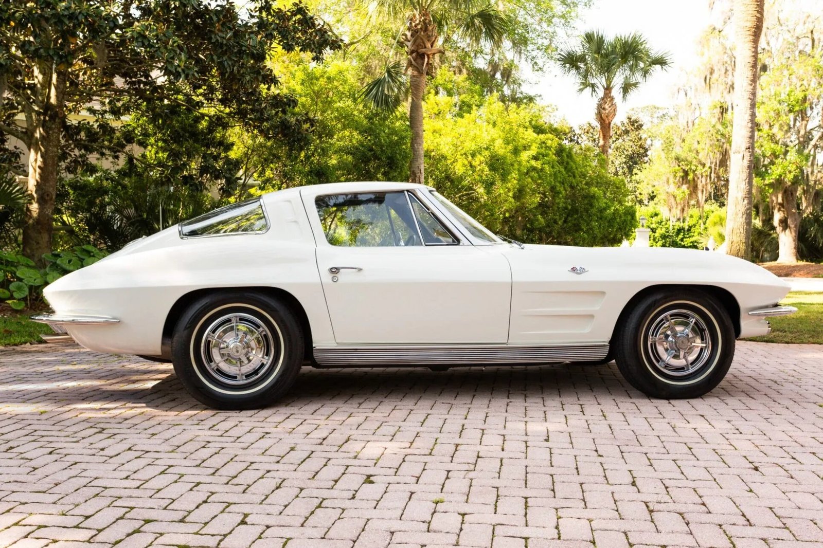 This 1963 Chevrolet Corvette split-window coupe is powered by a replacement 327ci V8 paired with a four-speed manual transmission, and it is finished in Ermine White over black vinyl. Work in preparation for sale involved replacing the fuel pump, water pump, and battery cables. The car is equipped with 15″ steel wheels with three-eared knock-off spinner-style hubcaps as well as power-assisted brakes, power windows, an AM/FM radio, and concealed headlights.