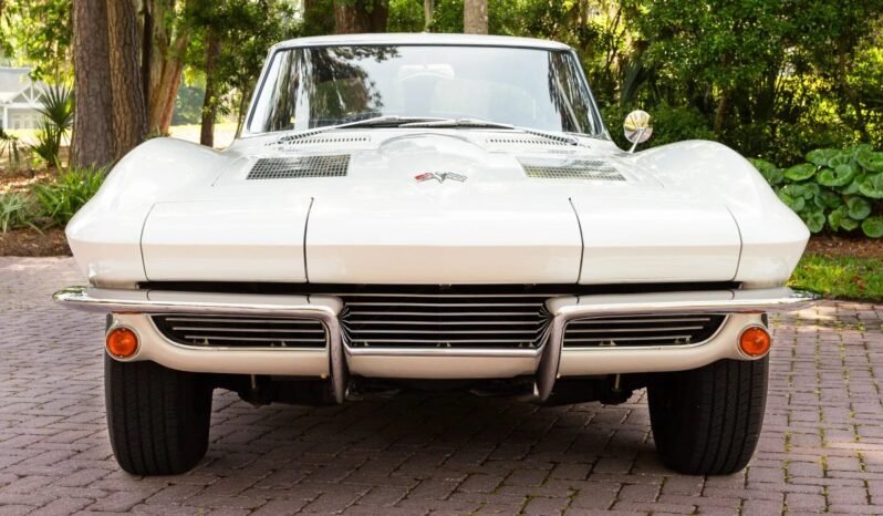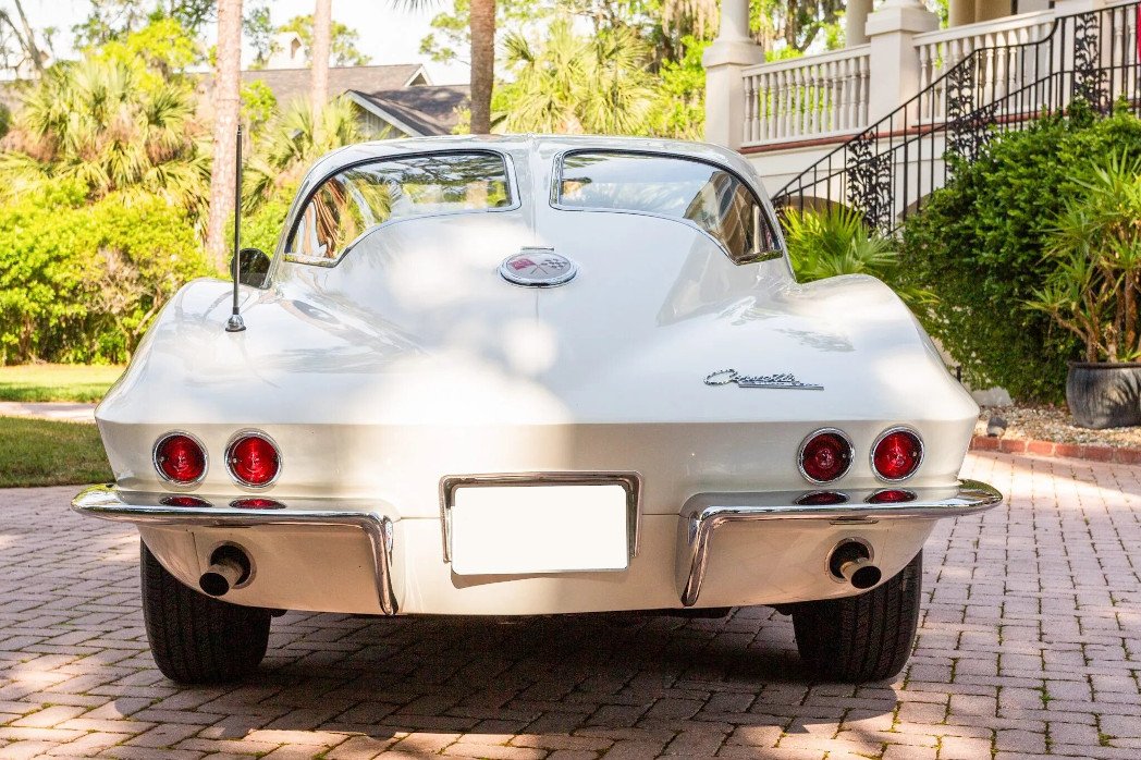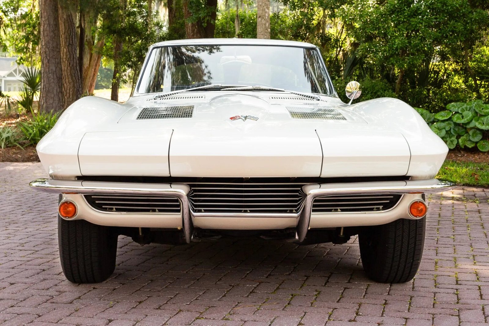 The fiberglass body left the factory finished in Ermine White (936) and is equipped with flip-up headlamps, fender vents, quad tail lamps, chrome bumperettes, and dual exhaust tips that exit through the rear valance.