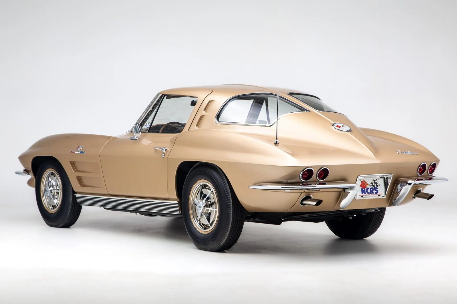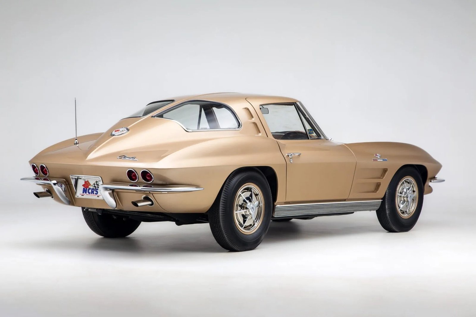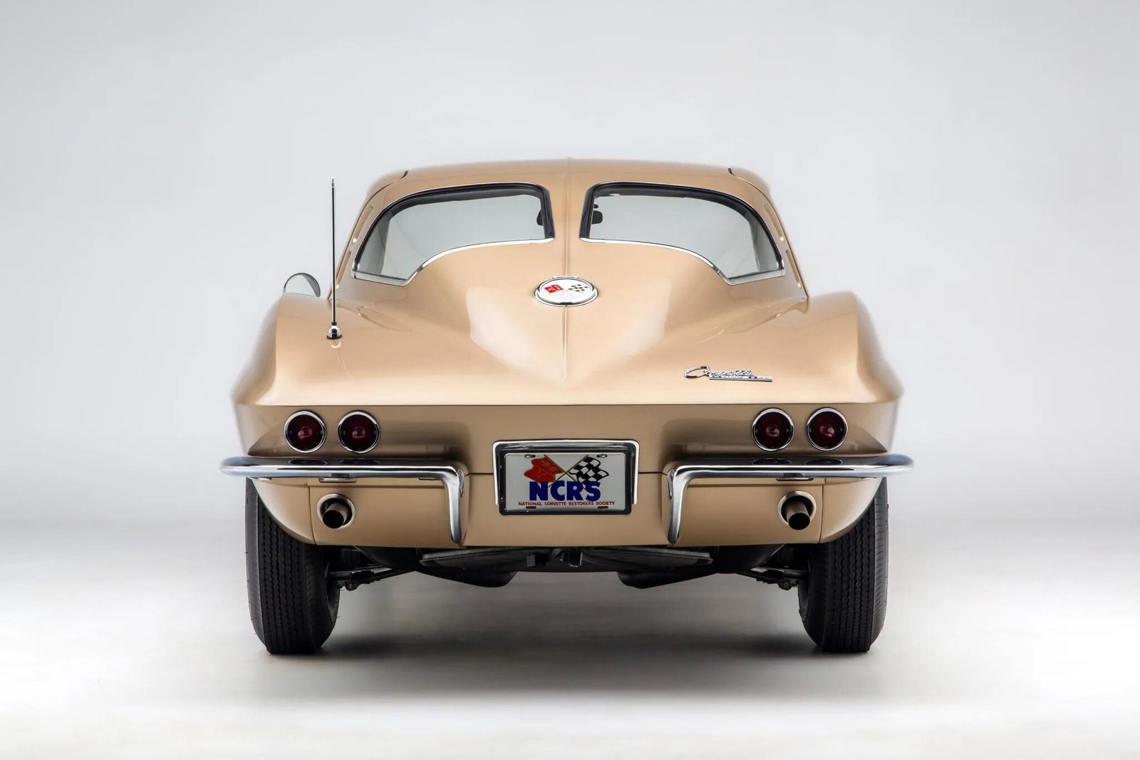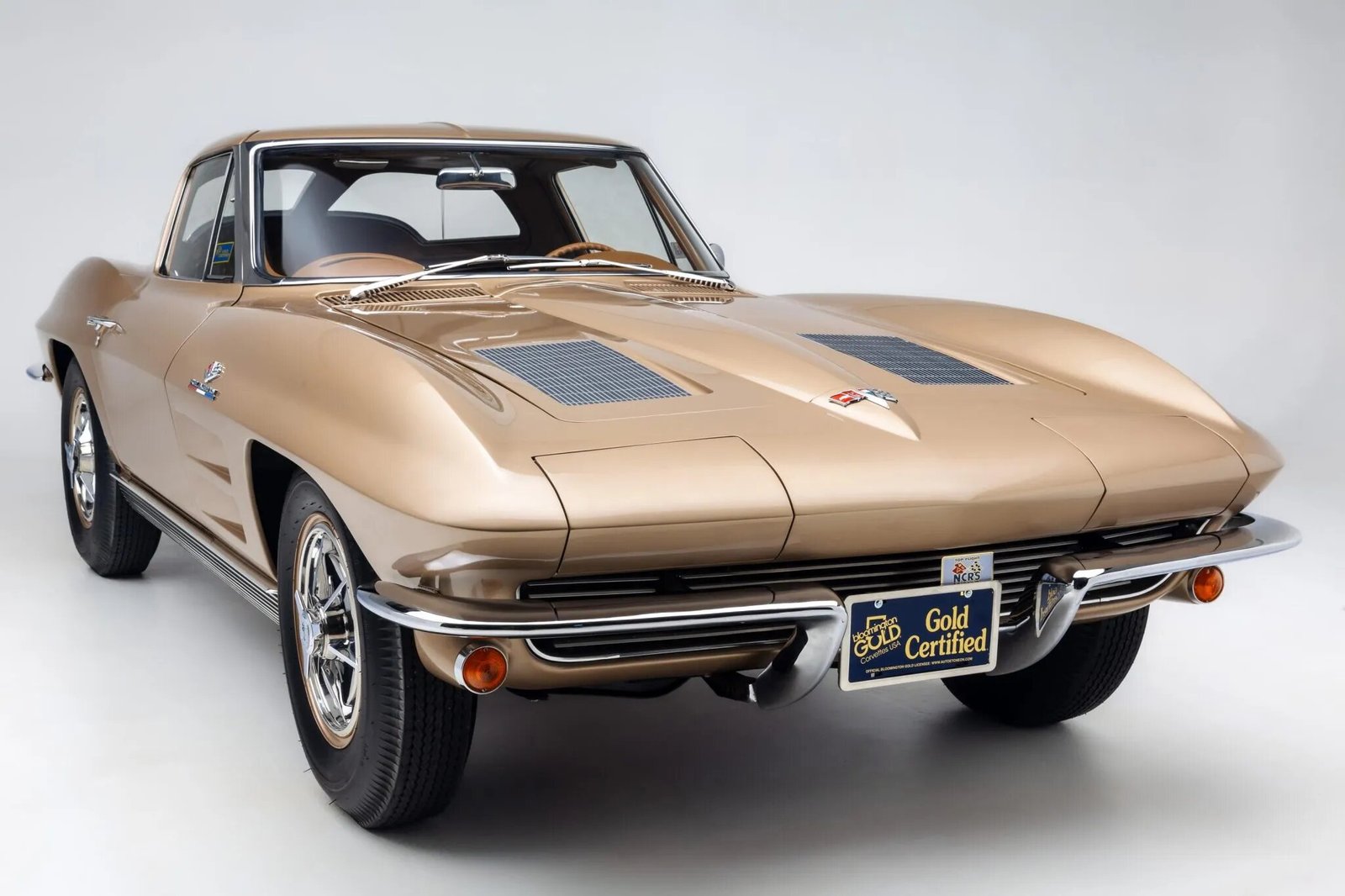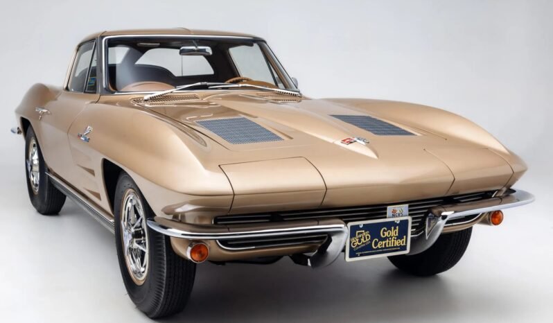 This 1963 Chevrolet Corvette split-window coupe is powered by a fuel-injected 327ci L84 V8 paired with a four-speed manual transmission, and it was refurbished with work that included a repaint in Saddle Tan in 2009. The car was subsequently awarded an NCRS Regional Top Flight award in September 2009, and the car was also Bloomington Gold certified in 2022. Features include 15″ steel wheels with three-eared knock-off spinner-style hubcaps, a Positraction differential, an AM radio, a dual exhaust system, and concealed headlights.