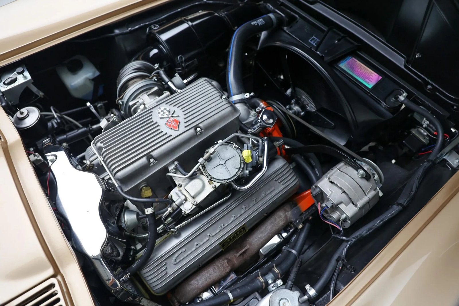 The fiberglass body was refinished in Saddle Tan (932) during the refurbishment that was completed in 2009. Features include flip-up headlamps, fender vents, quad tail lamps, chrome split bumpers, and dual exhaust tips that exit through the rear valance.