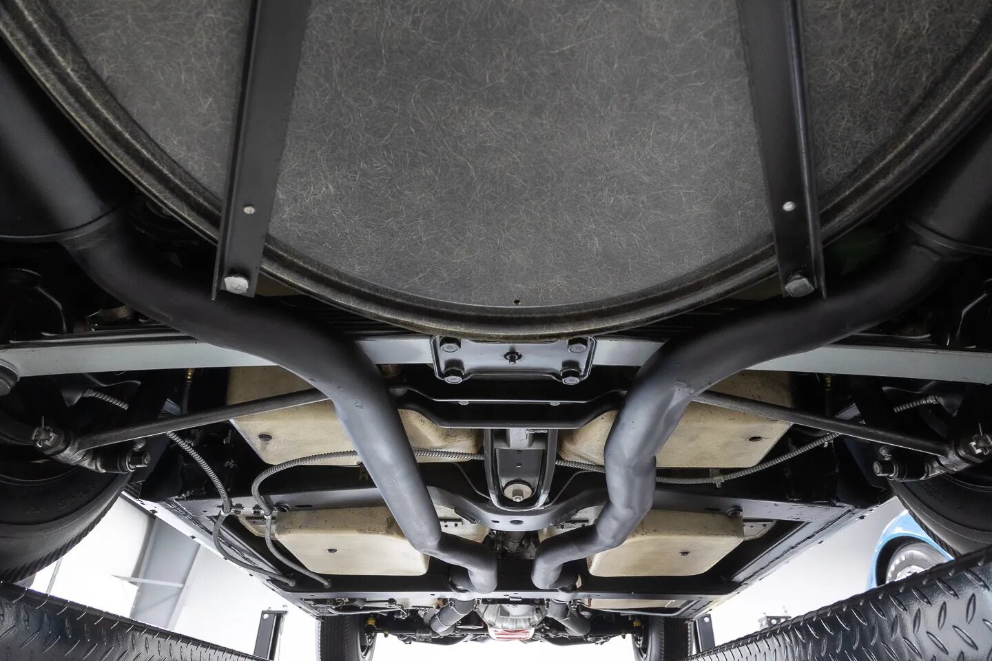 Silver-finished 15” steel wheels feature three-eared knock-off spinner-style hubcaps and are mounted with 6.70-15 Firestone tires. The C2 was the first Corvette to offer fully independent suspension, with upper and lower control arms at the front and a three-link setup with a transverse leaf spring at the rear. Braking is handled by four-wheel drums.